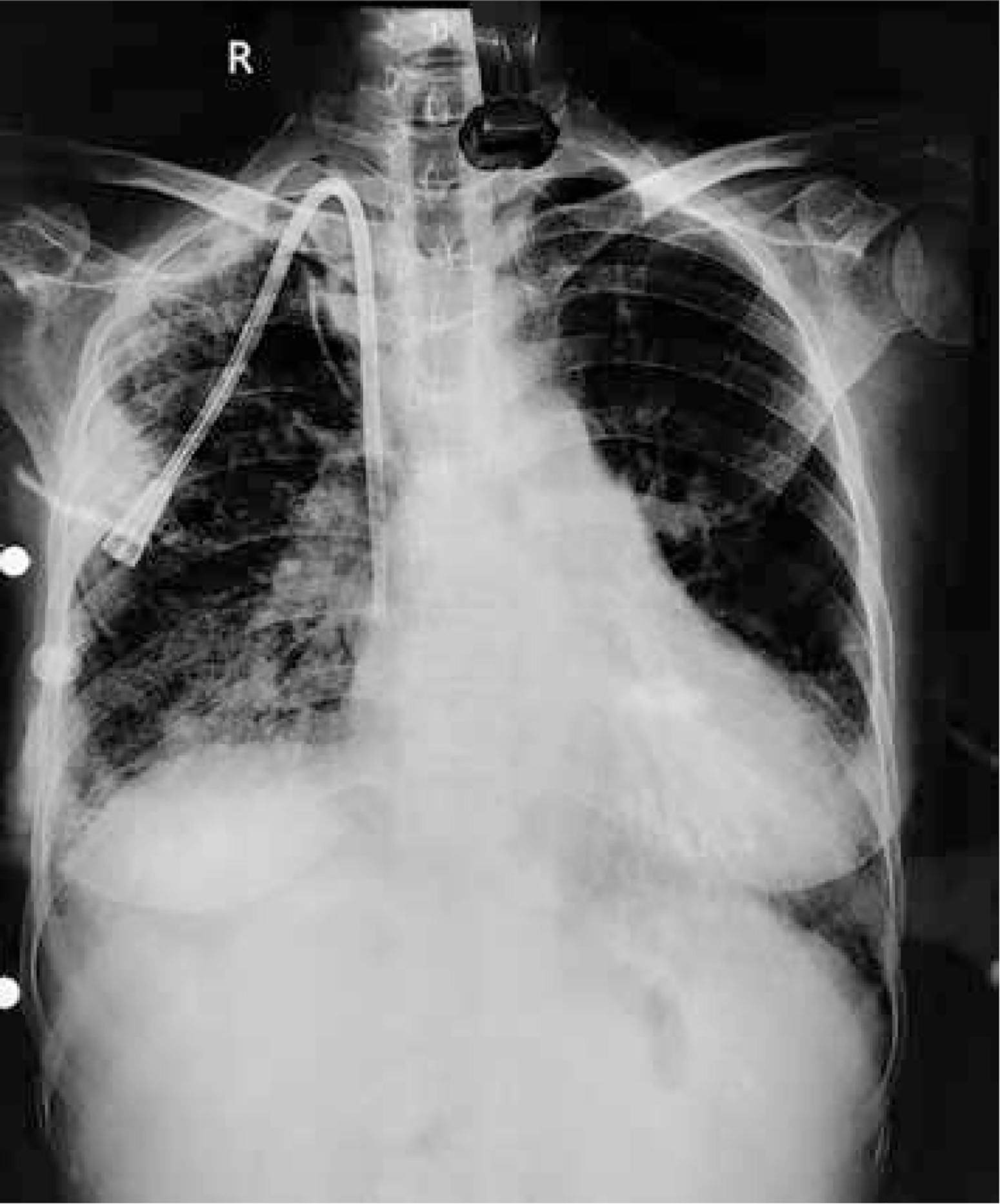 A 51-year-old chronic kidney disease patient with chronic obstructive pulmonary disease underwent catheter insertion with a Hemosplit 14.5 Fr haemodialysis catheter (Bard Access Systems, Utah, USA) through the right subclavian vein in the nephrology unit of our institute. The procedure was conducted with good flow through one port and poor flow through the other port. The catheter guidewire was removed completely but was seen to be coiled on extraction. Some amount of force was also required during the insertion of the catheter as reported by the operator. A post-procedural chest X-ray showed normal position of the catheter. Anticipating that the poor flow through one port could be due to abutment of the catheter against the vessel wall or due to a clot and because of the normal X-ray (Figure 1), the patient was taken for haemodialysis. Two hours into dialysis, the patient became hypotensive with a systolic blood pressure of 70 mm Hg. Dialysis was immediately terminated and imaging in the form of non-contrast neck and chest computed tomography (CT) in view of the patient’s renal status was done. It showed the catheter entering through the right supraclavicular region traversing posterior to the medial end of the clavicle, right subclavian vein, superior vena cava and traversing in the right part of the middle mediastinum. The catheter was seen in close contact with the right pulmonary artery and left atrium with air foci adjacent to the catheter in the left atrium (Figures 2 A, B). As attempts at haemodynamic stabilisation did not succeed, the patient was taken immediately into the operation theatre for exploration by the cardiovascular and thoracic surgery department.
