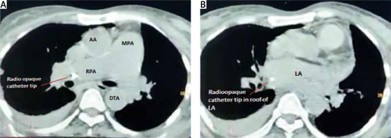 A – Catheter seen in the right pulmonary artery on non-contrast CT chest. B – Catheter seen in the left atrium on non-contrast CT chest