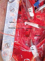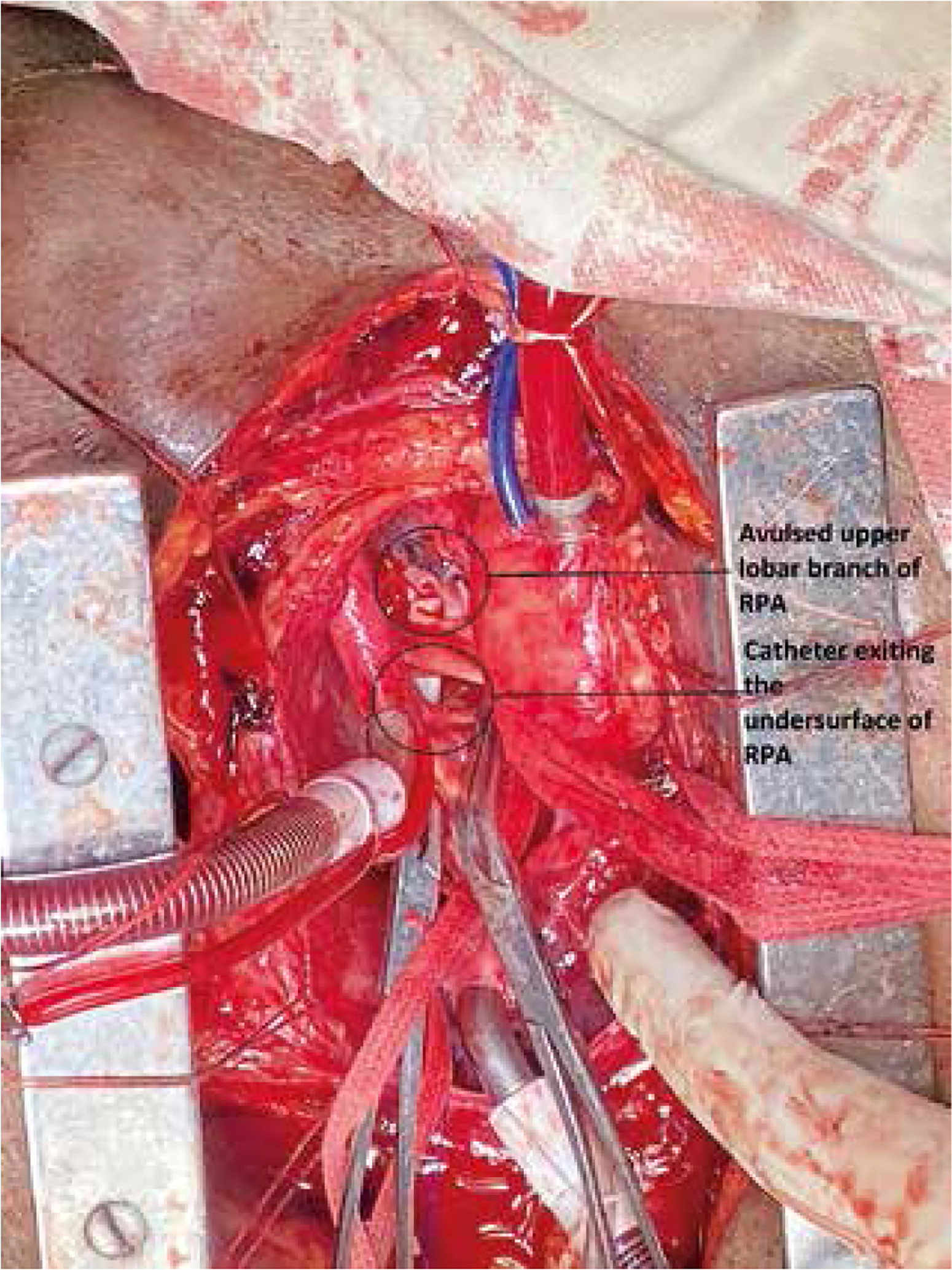 Invasive monitoring lines were taken. Standard midline sternotomy was done with preparations to go on cardiopulmonary bypass (CPB). Pericardiotomy revealed adhesions, hence the pericardium was initially opened minimally so as to allow purse string sutures over the aorta, superior vena cava and right atrium. The aorto-pulmonary septum and branches of the pulmonary artery were dissected. Cardiopulmonary bypass was instituted with aortocavoatrial cannulation as dissection around the pulmonary artery led to bleeding. The catheter tip was seen entering the roof of the left atrium after traversing through the right pulmonary artery (Figure 3). Purse string sutures were taken at the entry point of the catheter into the left atrium with polypropylene 4-0 (26 mm) and one of the two catheter tips was extracted from the LA. On tracing the catheter upwards, it was seen passing through the upper lobar branch of the right pulmonary artery avulsing and shearing it off at its origin and multiple places (Figure 4). The distal end of the avulsed artery was very friable and was in the midst of a group of matted lymph nodes. Due to these findings and given the compromised haemodynamics of the patient, we decided to sacrifice the upper lobar branch. After clamping the RPA, the catheter was extracted completely from the incision site and both ends of the avulsed branch of the RPA were under-run with polypropylene 5-0 (13 mm) sutures such that the RPA continued to supply the rest of the lung. Haemostasis was achieved and the patient was gradually weaned off bypass. The chest was closed over a mediastinal drain. Our total surgical time was 90 minutes with a CPB time of 40 minutes. After observing in the Cardiac ICU for 2 hours, the patient was shifted to the nephrology intensive care unit (ICU) on high ionotropic support of intravenous noradrenaline 0.2 μg/kg/min for further management. However, the patient had a stormy post-operative course complicated by respiratory failure and expired on the third post-operative day in the nephrology ICU. The exact cause of death could not be found as the relatives did not consent to a post mortem examination.