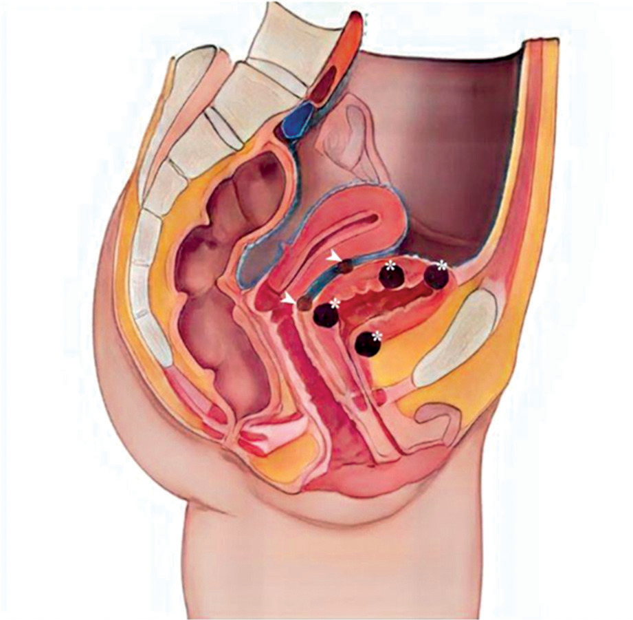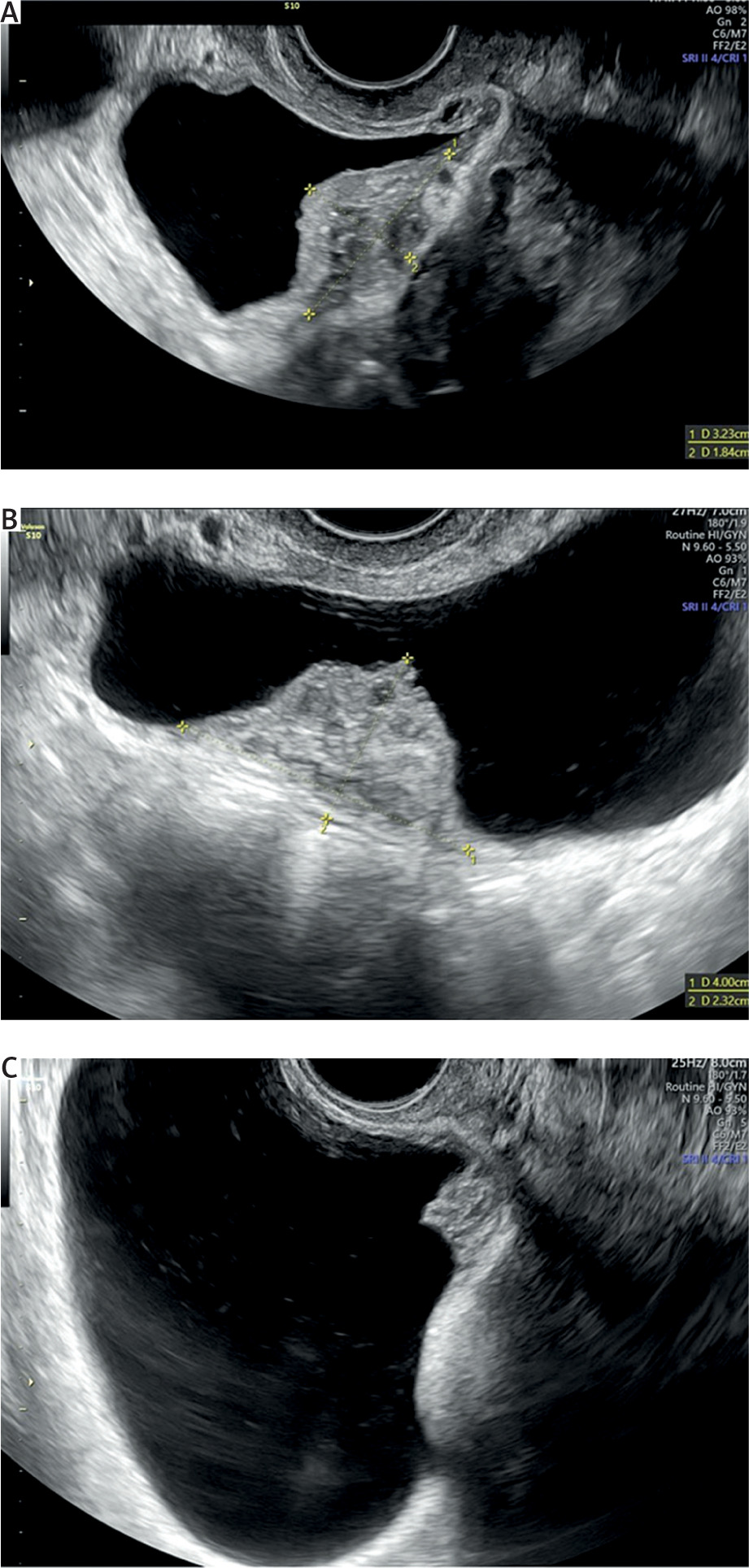 Endometriosis is a common gynaecological disease, which affects 10–15% of women in reproductive age. It is defined as the presence of functional endometrial foci outside the uterine cavity. Patients can experience a variety of nonspecific symptoms, but the most common are pain and infertility. Apart from this, endometriosis may present with haematuria, fatigue, painful rectal bleeding and metabolic and psychiatric disorders such as hypoglycaemia, depression, or anxiety [1–3]. Female infertility can be caused by different mechanisms such as fallopian tube destruction, chronic pelvic inflammation, changes in the immune system functions, and altered hormonal balance. Furthermore, inflammatory cytokines and cells affect eutopic endometrium, causing an implantation failure [1, 4]. Endometriosis is divided into three types: ovarian endometriosis, superficial (peritoneal) endometriosis, and deep endometriosis (DE) [1]. Deep endometriosis is defined as endometriosis invading pelvic organs more than 5 mm beneath their surface. One of the rare forms of endometriosis is urinary tract endometriosis (UTE), which can either occur as deep or superficial endometriosis. Urinary tract endometriosis affects 0.3–12% of women with endometriosis and this condition refers to/occurs in 20–52.6% of patients with DE [3, 5]. The most common location of UTE is the bladder, while the most dangerous type of UTE is ureteral endometriosis, because it can lead to silent and irreversible kidney damage. Bladder endometriosis (BE) is defined as the presence of endometrial foci in the vesical detrusor muscle (Figure 1). Bladder endometriosis most commonly affects the base and dome of the bladder [3]. The vesicouterine pouch or anterior cul-de-sac is also a common site of endometriotic involvement. Either peritoneal or deep endometriotic implants involving the serosal surface of the uterus often determine adhesions between the peritoneal folds of the bladder dome and the uterus with anteflexion of the uterus and obliteration of the anterior cul-de-sac. Bladder endometriosis was described for the first time in 1921 by Judd [6]. Since then, numerous case reports and research studies have been published regarding this topic. Despite the wide literature, the pathogenesis of BE is still unclear. Most popular theories explaining the pathogenesis of BE are retrograde menstruation, coelomic metaplasia, and the spread of stem/progenitor cells [3, 7]. At the moment, retrograde menstruation theory is considered to be the most explanatory. This theory states that menstruation blood with functional endometrial cells flows to the pelvic cavity through the fallopian tube orifices [1, 8]. Endometrial cells adhere to the peritoneum and start the inflammation facilitating the vesicouterine pouch endometriosis (EVUP) development and bladder infiltration. Novellas et al. have found that the endometrial cells implant to the outer layers of the bladder and later infiltrate the inner layers [9]. On the other hand, the retrograde menstruation hypothesis cannot explain the isolated BE form, in which case other theories seem to be more suitable. In addition, BE may be of iatrogenic origin, such as a consequence of bladder destruction during caesarean section (CS) [3, 7]. Bladder endometriosis presents a range of nonspecific symptoms such as urinary bladder pain, cyclic or noncyclic pelvic pain, dysuria, dyspareunia, increased urinary frequency, urinary incontinence, haematuria, and elevated intravesical pressure. Thus, the differential diagnosis of BE is challenging considering various mimicking diseases such as urinary tract infections, interstitial cystitis, bladder stones, and carcinoma [3, 7, 10]. As a chronic inflammatory disease, endometriosis can also have an impact on mental health, sleep quality, and life quality in general. The sleep and life quality of patients suffering from endometriosis is poorer than in healthy women. The main cause of sleep disturbances is pain and nocturia, but some researchers indicate that sleep insufficiency can in turn increase inflammation processes and worsen the pain. A similar pathophysiological mechanism can cause psychiatric disorders [11]. The most frequently used imaging modality in BE and EVUP is transvaginal ultrasonography (TVS) (Figure 2). Besides TVS, magnetic resonance imaging (MRI), transabdominal ultrasonography (US), or cystourethroscopy are used as supplementary imaging methods for those conditions [3, 10]. Surgical resection of endometrial foci is a gold standard therapy, which enables/makes it possible to completely treat the disease [3, 7, 12]. Surgical removal may be done by laparotomy, laparoscopy, or using a surgical robot. Apart from surgical resection, pharmacotherapy plays a key role in BE, leading to clinical improvement [3, 7]. Several treatment options such as progesterone-based therapy, combined oral contraception, and GnRH analogues are available. In our study we have decided to analyse the variety of symptoms and the outcomes of laparoscopic surgery done on BE and EVUP patients.