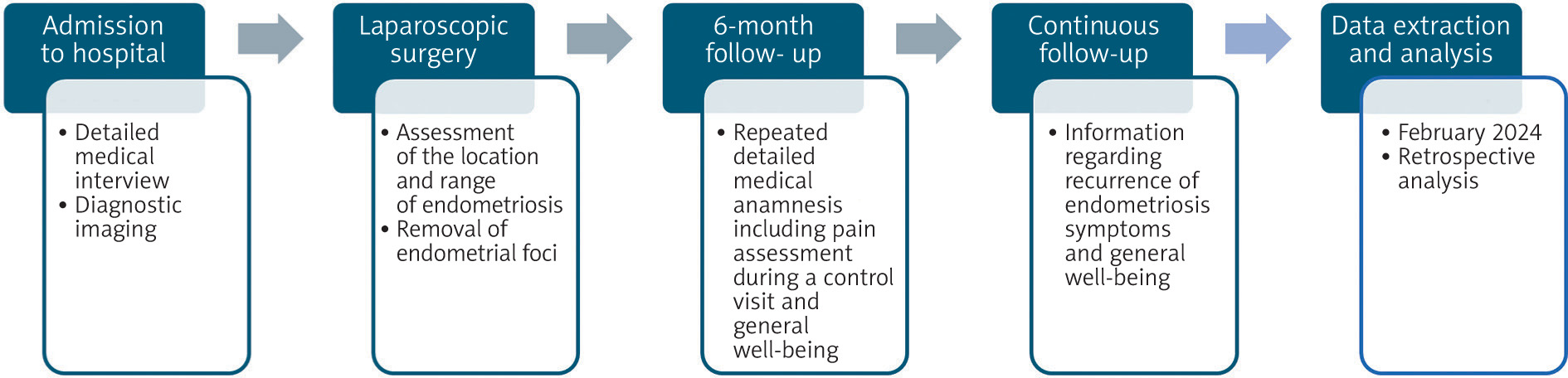 A retrospective cohort study was conducted including the patients who underwent laparoscopic surgery due to BE and/or EVUP in the gynaecological clinic in the tertiary hospital in central Poland in 2017–2023 (n = 29). The data was collected and extracted from patients’ history of disease in February 2024. Data extracted from patients’ history included their age at the moment of the operation, number of pregnancies, type of delivery, history of miscarriages, use of hormonotherapy, location of endometriotic lesions, and surgical procedure type. The endometriosis foci location was diagnosed mainly by using TVS, only 1 patient was additionally diagnosed by using MRI. Moreover, it contained detailed patient histories with information about the symptoms and their severity taken on the day of admission to the hospital. The pain intensity was evaluated with the visual analogue scale (VAS). Visual analogue scale is a 10-grade scale, which is used for patients in self-assessment of pain. Visual analogue scale range is 0–10 points. A 0-point score resembles/means no pain, and a 10-point score reflects the worst pain imaginable. Visual analogue scale result of 1–3 indicates mild pain, 4–6 points moderate pain, and a score 7–10 highlights/demonstrates shows severe pain. Six months after the operation, 18 patients had follow-up visits, 10 of them had BE and 8 – EVUP. The patients were asked again about the intensity and type of pain they have experienced after the operation. Additionally, patients were asked about the frequency of urinary tract infections and urinary incontinence before and after the surgery. Moreover, the patients answered questions about a possible recurrence of endometriosis symptoms and their general well-being during routinely planned continuous follow-up (Figure 3).