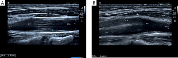 The intima-media complex was routinely examined in ultrasound imaging, and patients were divided according to the CIMT 0.8 mm cut-off value, as presented in Figures 1 A, B.