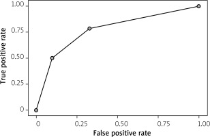 The receiver operator curve (ROC) for CIMT over 0.8 mm predictions composed of two parameters – BMI over 30 and high statin dose (at least 20 mg of rosuvastatin or 40 mg of atorvastatin daily) – was characterized by an AUC of 0.794 with an F-measure of 0.417 and yielding sensitivity of 35.7% and specificity of 91.8%, as presented in Figure 2.