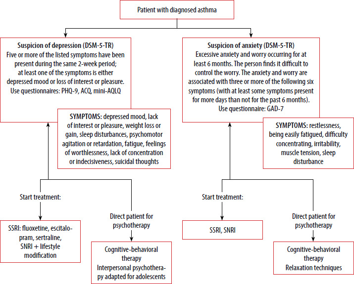 Routine screening of asthma patients for depression, combined with prescribing antidepressants when clinically indicated, can improve both psychiatric symptoms and asthma control [30]. The abbreviated diagnostic pathway for asthma patients with psychiatric disorders is presented in Figure 1.