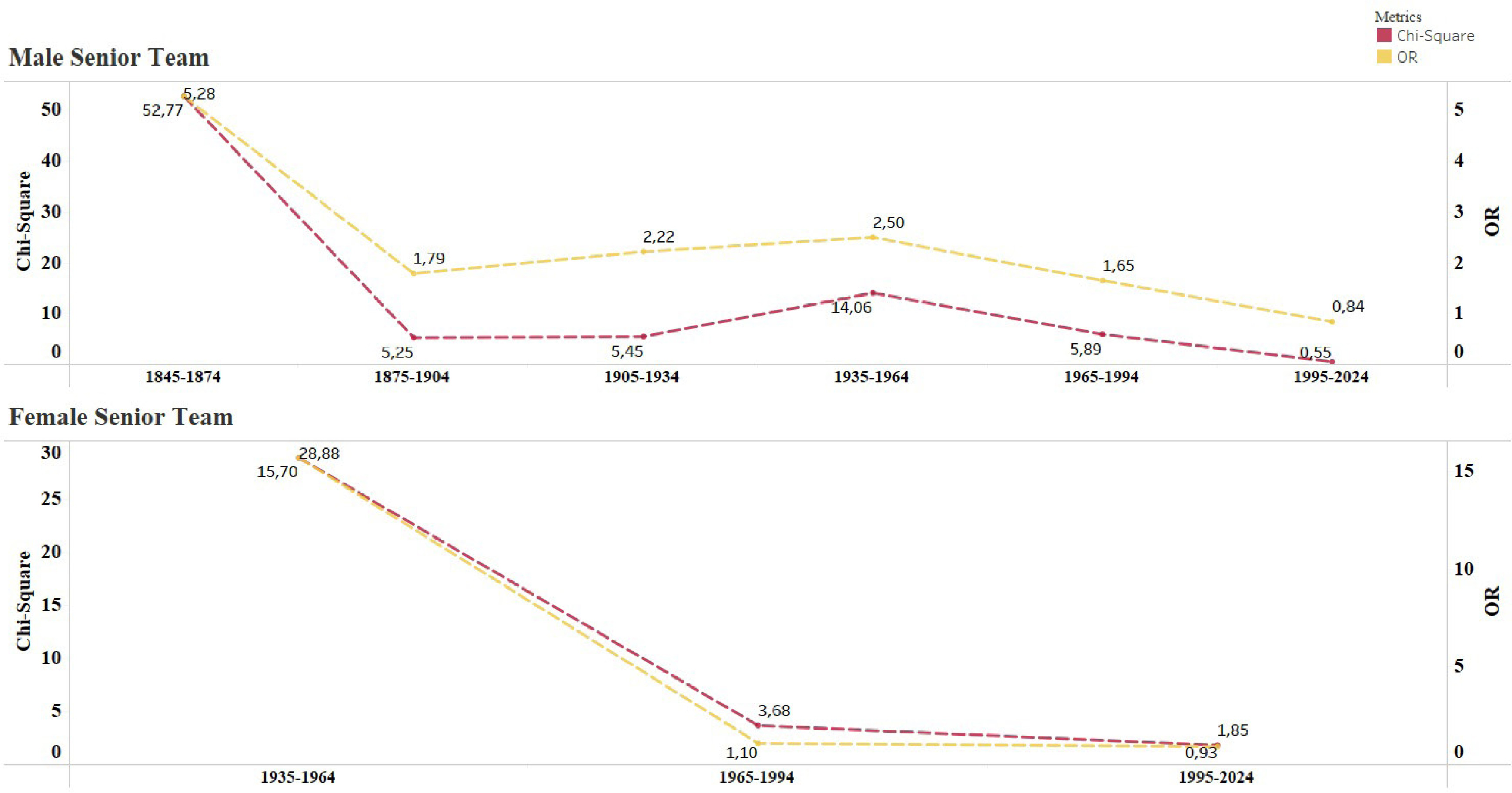 The analysis of the RAE over time, as depicted in Figure 1, reveals notable trends in both male and female senior teams. For male senior teams, the chi-square values and ORs have shown a consistent increase over a 30-year period, particularly from 1965–1994 and 1995–2024. This suggests that the RAE has become more pronounced in recent decades, potentially due to increased competitiveness, professionalization, and early specialization in sports [1–2]. Similarly, female senior teams exhibit a rising trend in the RAE, albeit starting from a lower baseline during the 1935–1964 period. The increasing ORs over time indicates that relatively older female players are increasingly over-represented in the senior teams, mirroring trends observed in male soccer cohorts.