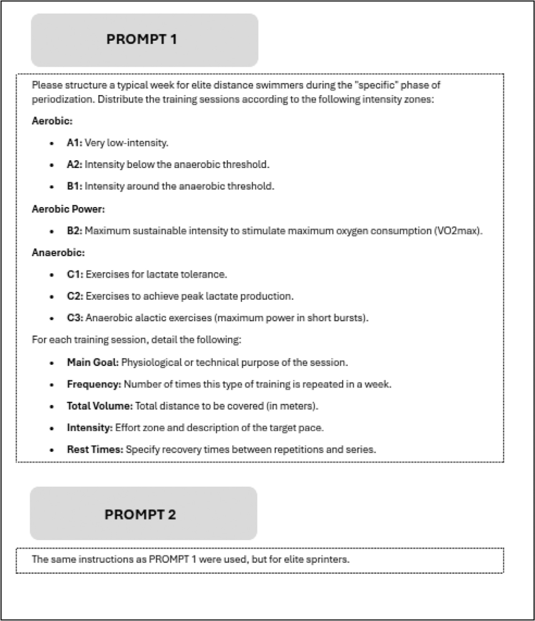 Instructional prompt provided for designing a weekly training program for elite swimmers during the “specific” phase of periodization. The prompt categorizes intensity zones into aerobic and anaerobic categories, specifying the main goals, frequency, total volume, intensity, and recovery times for each training session. Two versions are presented: one for distance swimmers (Prompt 1) and another for sprinters (Prompt 2).