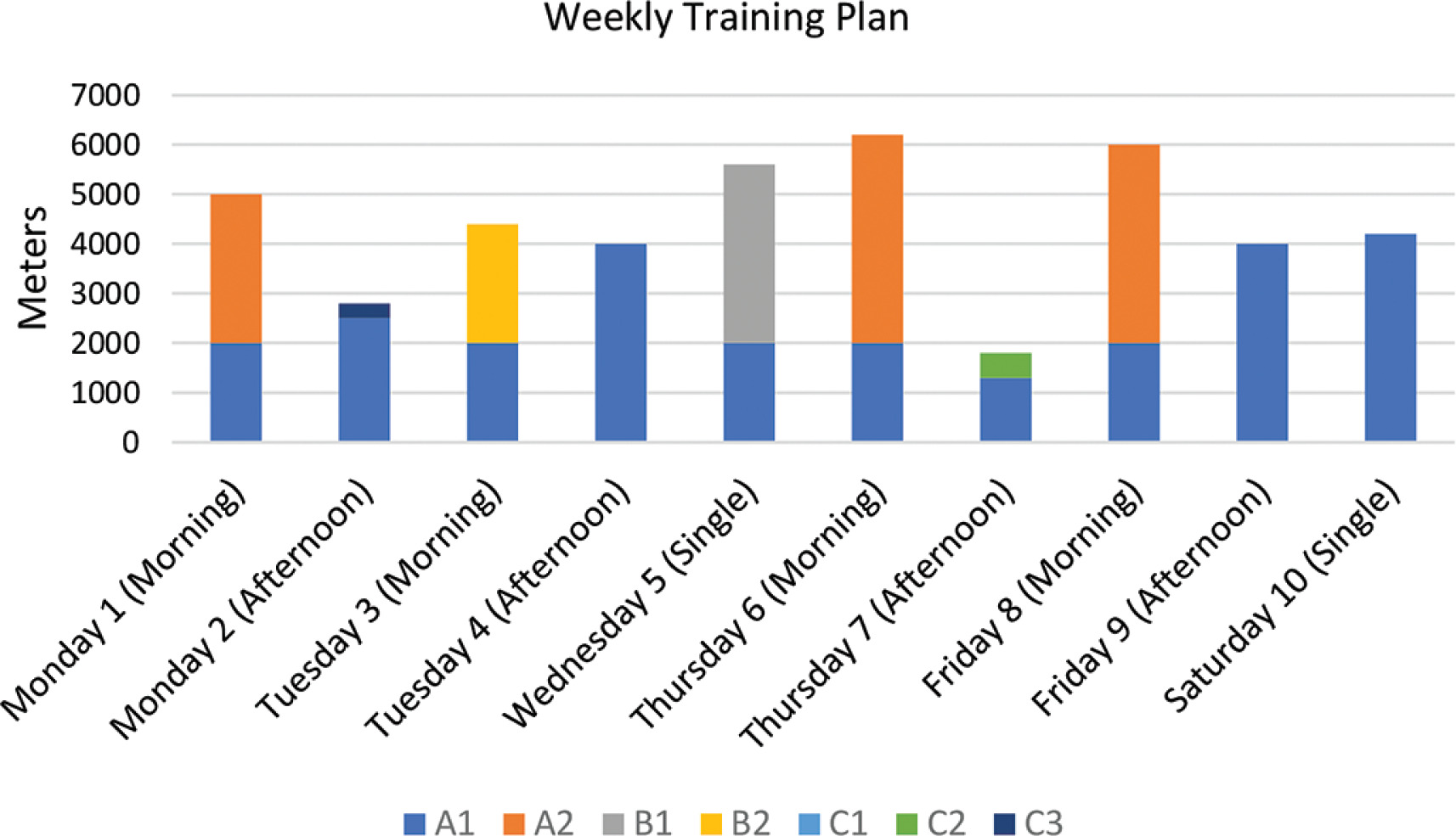 Weekly training plan for distance swimming specialists, showing the breakdown of swimming volume per session for each specific intensity zone (A1, A2, B1, B2, and C1).