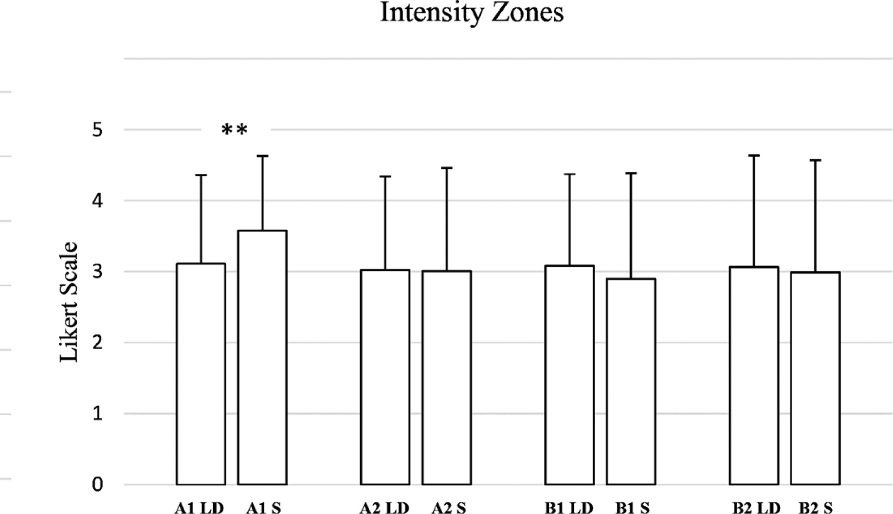 Evaluation by coaches and athletes of the AI-generated weekly training plan for long distance (LD) and sprint athletes (S), broken down into intensity zones. (A1: Very low-intensity; A2: Intensity below the anaerobic threshold; B1: Intensity around the anaerobic threshold; B2: Maximum sustainable intensity to stimulate maximum oxygen consumption). ** → p ≤ 0.01.