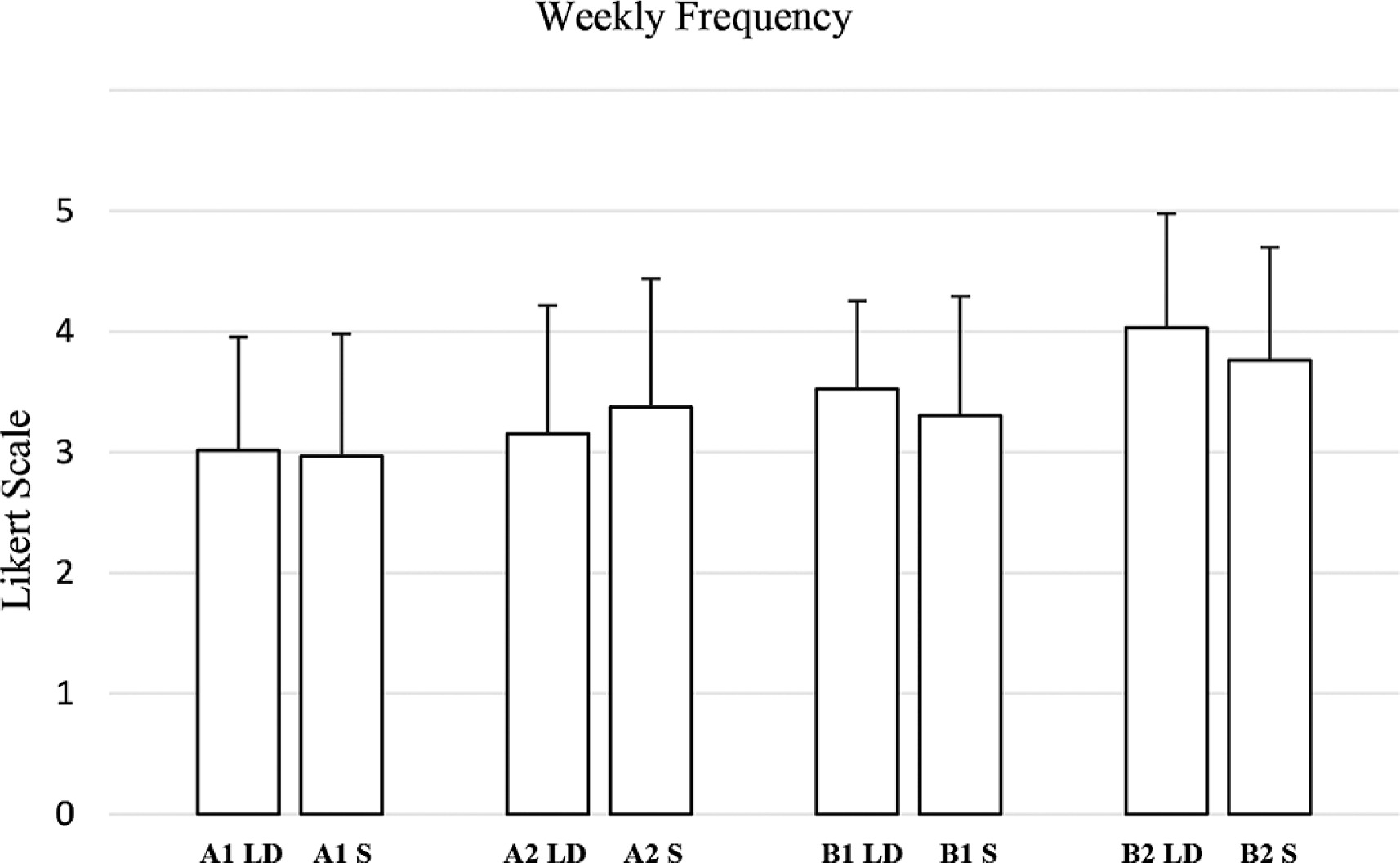 Regarding weekly frequency (Figure 6), no significant differences were observed in most comparisons. For A1 weekly frequency, the test yielded a Wilcoxon statistic of 286.0 (p = 0.664, RBC = 0.0833, negligible effect). Similarly, A2 weekly frequency showed a Wilcoxon statistic of 201.0 (p = 0.142, RBC = -0.2834, small effect). In contrast, B1 weekly frequency (W = 279.0, p = 0.069, RBC = 0.3744) and B2 weekly frequency (W = 282.0, p = 0.016, RBC = 0.4921) exhibited moderate to large effect sizes.