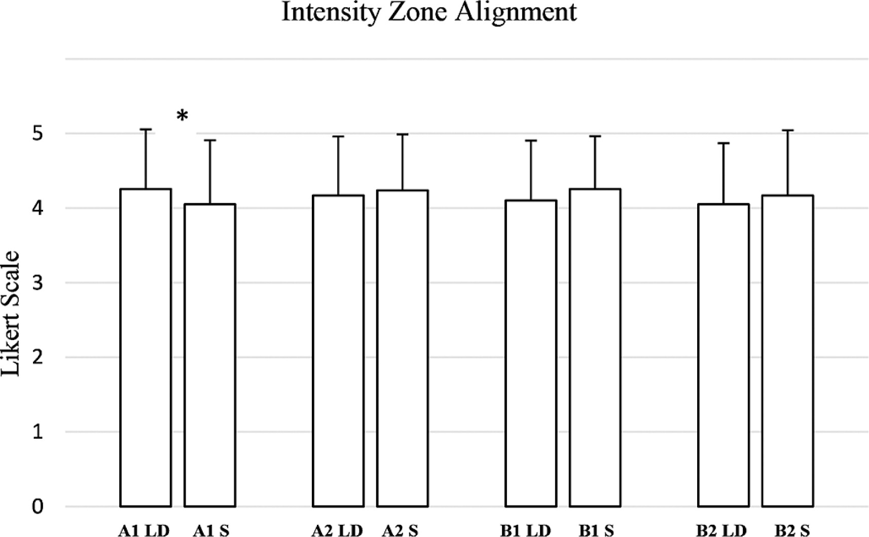 Evaluation by coaches and athletes of the weekly training plan generated by the AI for long-distance (LD) and sprint (S) athletes, divided into intensity zones in relation to “intensity zone alignment” criteria. (A1: Very low-intensity; A2: Intensity below the anaerobic threshold; B1: Intensity around the anaerobic threshold; B2: Maximum sustainable intensity to stimulate maximum oxygen consumption). * → p ≤ 0.05.