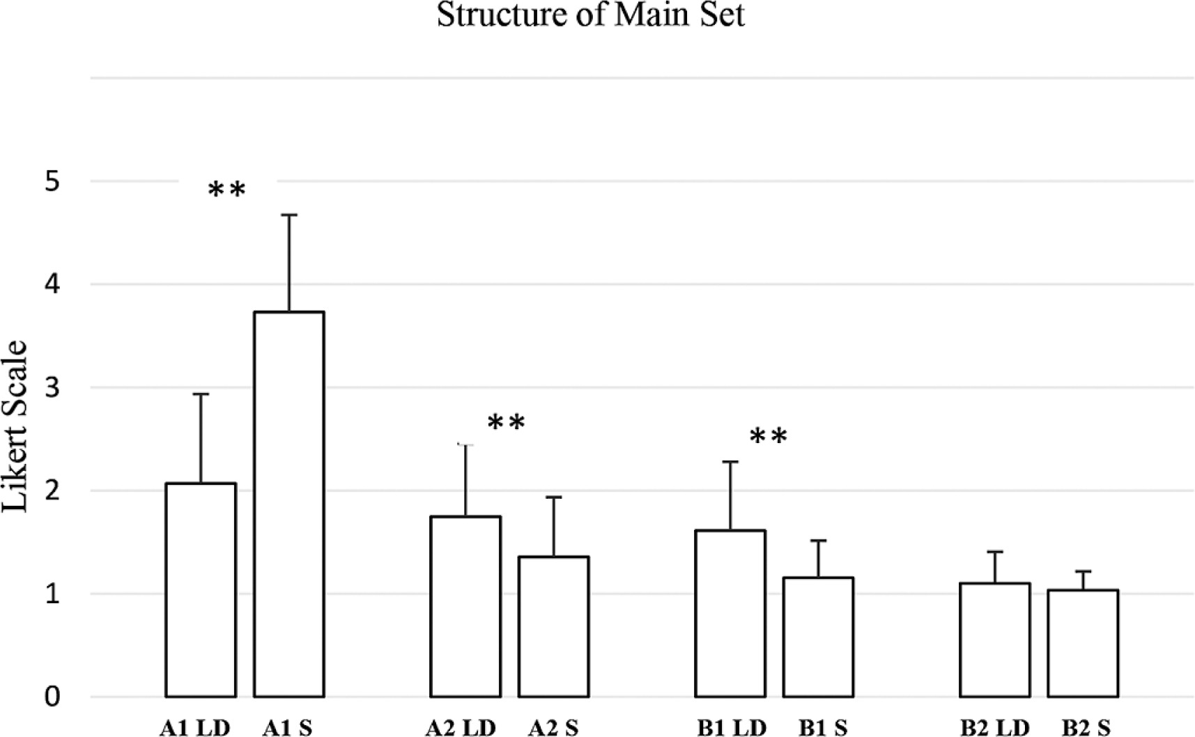 In contrast, the structure of the main set revealed the most pronounced differences (Figure 8). A1 structure of the main set (W = 11.0, p < 0.001, RBC = −0.9820), A2 structure of the main set (W = 301.0, p < 0.001, RBC = 0.8523), B1 structure of the main set (W = 300.0, p < 0.001, RBC = 1.0000), and B2 structure of the main set (W = 10.0, p = 0.072, RBC = 1.0000) all exhibited very large effect sizes.