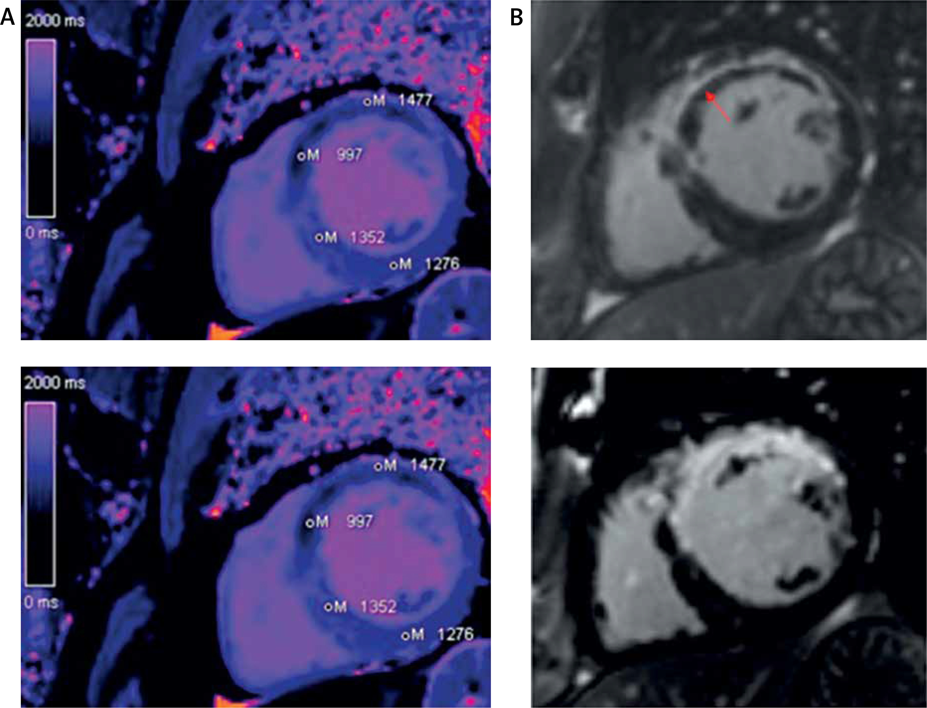 Cardiac magnetic resonance (CMR) has grown over the past several years as a widely used modality in the evaluation of myocardial injury, which is mostly based on the late enhancement (LE) technique [1–3]. The recently developed CMR mapping imaging is a promising tool in myocardial evaluation, which relies on changes in T1 and T2 relaxation times and extracellular volume (ECV) [1–3]. Contrary to LE, the native T1 and T2 mapping technique is a quantitative evaluation, does not require administration of gadolinium contrast, and may be helpful in the evaluation of patients in whom contrast is contraindicated, such as those with severe renal failure.