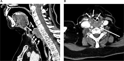 Contrast-enhanced CT neck scan demonstrating malignancy of the hypopharynx. A) Sagittal view and B) axial view. A) Sagittal CT imaging shows enhancing infiltrating soft tissue thickening, along with the post-cricoid posterior hypopharyngeal wall, with extension above and below the vocal cords. B) Axial CT imaging shows that at the level of the false vocal cords, there is heterogeneously enhancing bulky soft tissue in the posterior hypopharyngeal wall, with extension and infiltration into the paraglottic fat anteriorly