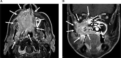 Contrast-enhanced MRI neck scan demonstrating an extensively infiltrating necrotic malignancy centered in the right maxillary sinus, with heterogeneously bright contrast enhancement. A) Axial MRI imaging demonstrates a large avidly enhancing tumor centered in the right maxillary sinus. This extends anteriorly and laterally through the maxillary walls to the skin surface involving the right nasolabial fold and the facial muscles. Posteriorly, this extends into the pterygopalatine fossa, post-nasal space, and right masticator space infiltrating the right medial and latent pterygoid muscles. B) Coronal NIRI imaging demonstrates a large enhancing tumor centered in the right maxillary sinus, with non-enhancing areas of necrosis. This extends medially into the nasal cavity involving right middle and inferior nasal turbinate, along with infiltration of the right hard palate inferiorly
