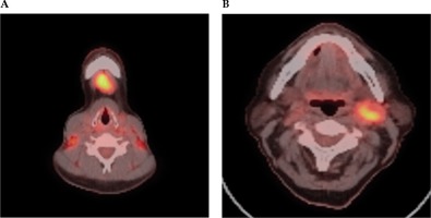 Recently, there has been a development of new PET radiotracers, which include amino acid radiotracers, specific for detection of HNSCC, radiolabeled antibodies for tumor angiogenesis characterization, and PET with 18 [F] fluorothymidine as a marker of tumor hypoxia. However, these require systematic clinical studies before they can be used for patient management. Example of FDG PET-CT in a case of cancer of unknown primary is presented in Figure 3.