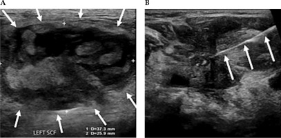 A) Ultrasound demonstrating measurements of a large partially solid-cystic mass of lymph nodes in the left supraclavicular fossa (SCF). B) A fine needle aspiration was subsequently performed. Cytology results confirmed metastatic squamous cell carcinoma. A 25 G needle is delineated entering the left SCF lesion, whilst performing a fine needle aspiration