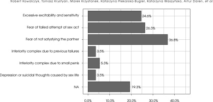 The answers given by the majority of the patients indicate that their partners reach orgasm during sexual intercourse “mostly” (49.1%) or “always under normal circumstances” (26.3%). However, 19.3% indicated that it happens rarely. The partners strongly react to the stimulation of the external genitalia, especially the clitoris (70.2%), rather than inside the vagina (1 person did not answer). Intercourse was more often initiated by males (52.6%) or both partners equally (33.3%) than by women. The most common method of controlling the timing of ejaculation (26.3%) was stopping further body movements before the excitement became too intense. The most frequent and noticeable psychological problem related to the male sexual life was anxiety about not giving sexual satisfaction to the partner (36.8%). At the same time, the least common difficulties were severe mood disorders or inferiority complexes regarding participants’ sexual effectiveness or their own sexual anatomy (Figure I).