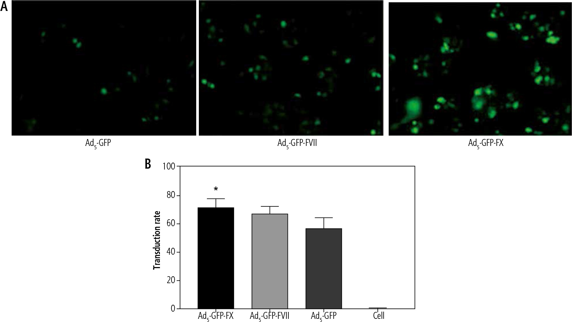 To determine the transduction rate between these groups, first we investigated the transduction efficiency of Ad5-GFP loading with FVII or FX. The GFP signal detection under fluorescent microscopy and flow cytometry showed that FX and FVII could increase the rate of entry [8]. The more detailed data of flow cytometry also showed that the FX can enhance the virus transduction rate up to 72%. A comparison of the role of FX and FVII in transduction efficiency of adenovector was reported for the first time.