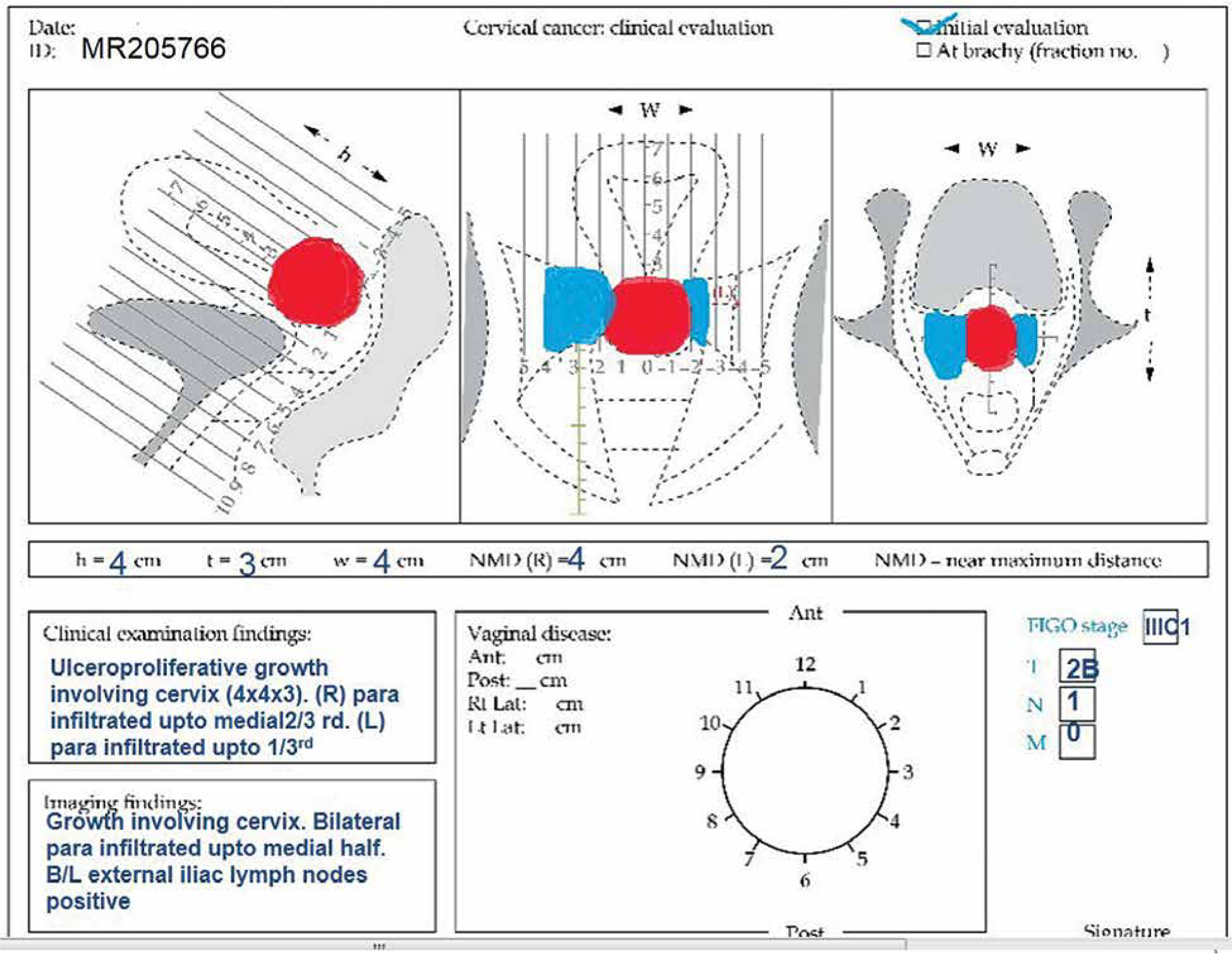 All patients who received chemoradiation with curative intent and planned for hybrid IC/IS brachytherapy were prospectively included for analysis. Patients with residual disease > 30 cc or target width > 4 cm, or asymmetric target at the time of brachytherapy were planned for hybrid brachytherapy. Patients, in whom the uterus could not be sounded, or when there was extensive residual disease involving mid and lower vagina or lateral parametrium, were excluded. An ethical and scientific review board approval was obtained prior to the study. A thorough clinical examination was performed at presentation and documented in the form of clinical diagrams (Figure 1). Diagnostic investigations included a biopsy, baseline blood investigations (complete blood picture, blood urea, and serum creatinine), chest X-ray, and MRI of abdomen and pelvis. A whole body PET-CT scan was performed in patients who agreed for the scan, but it was not compulsory. Response assessment post-EBRT was documented in clinical diagrams by performing clinical examination and MRI before brachytherapy.