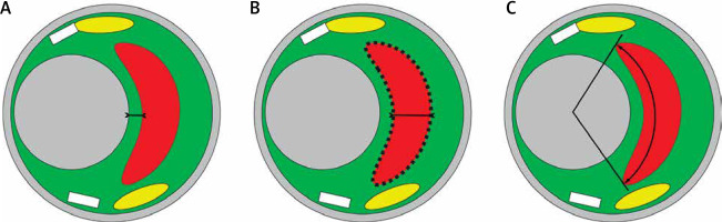 Schematic presentation of key components of the atherosclerotic plaque in relation to their architecture and plaque rupture risk [24, 25]. Today, these components can be quantified in vivo with virtual histology (VH-IVUS) using a recently validated novel VH-IVUS algorithm – quantitative virtual histology, qVH [21]. Color-coding is consistent with the VH-IVUS tissue map representation (fibrous tissue – green, necrotic core – red, calcium – white, fibro-fatty – yellow). A – fibrous cap thickness, B – necrotic core area and thickness, C – necrotic core angle. For a typical example of measurements performed in this study see Figure 3
