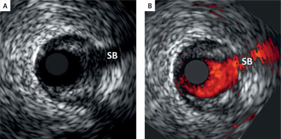 An illustrative example of fundamental importance of performing a matched-image (gray-scale IVUS/VH, A, and ChromaFlo, B) combined analysis to improve accuracy of the plaque luminal border delineation and ensuring same-spot analysis at baseline at follow-up. As the plaque luminal border may not be easy to determine (example in A), matched-image analysis, we introduced a routine application of a “matched image” analysis within the qVH algorithm [21]. This enables minimization of errors in plaque content quantification by VH analysis, that is critical for quantitative evaluation of the plaque composition, and in particular for the qVH measurement of fibrous cap thickness, cf. Figures 1 and 3). “Matched image” analysis plays also an important role in a longitudinal study of plaque evolution that requires a plaque image capture in the same spot (note side branch, SB, as a landmark, to minimize the likelihood of erroneous detection of a change in plaque characteristics as a result of a change in the sampling site along the arterial lumen) [28]