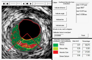 Typical example of quantification of key morphologic parameters of the atherosclerotic plaque using a novel image analysis algorithm (quantitative Virtual Histology, qVH). Commercially available software (QIvus 2.0, Medis Medical Imaging Systems, the Netherlands) was customized for qVH caliper and line tracking and was recently validated [21]. Confluent necrotic core is tracked on the left; numeric results of the measurements are shown in the top panel on the right. Necrotic core area – 1.177 mm2, necrotic core angle – 88.6°, peak necrotic core thickness – 0.536 mm. This contracts with the typical “automatic” software measurements (bottom panel on the right) that consider all pixels in a given color. Note that true necrotic core area is 1.18 mm2 rather than 1.47 mm2. The fibrous cap minimal thickness is 0.31 mm, consistent with a thick-cap fibroatheroma. Also note that the “automatic” software quantification provides a total (per cross-sectional area) content of each of the four principal VH-IVUS–detectable plaque components (fibrous, fibro-fatty, necrotic core, dense calcium), expressed in absolute units, mm2, or as proportion of the plaque area (%) but not of the parameters that are critical for plaque behavior in the context of rupture risk (cf., Figure 1). It may be important to realize that that the “automatic” quantification suffers from several types of artefacts, including the “calcium-associated” (pseudo) necrotic core [21, 29, 30]