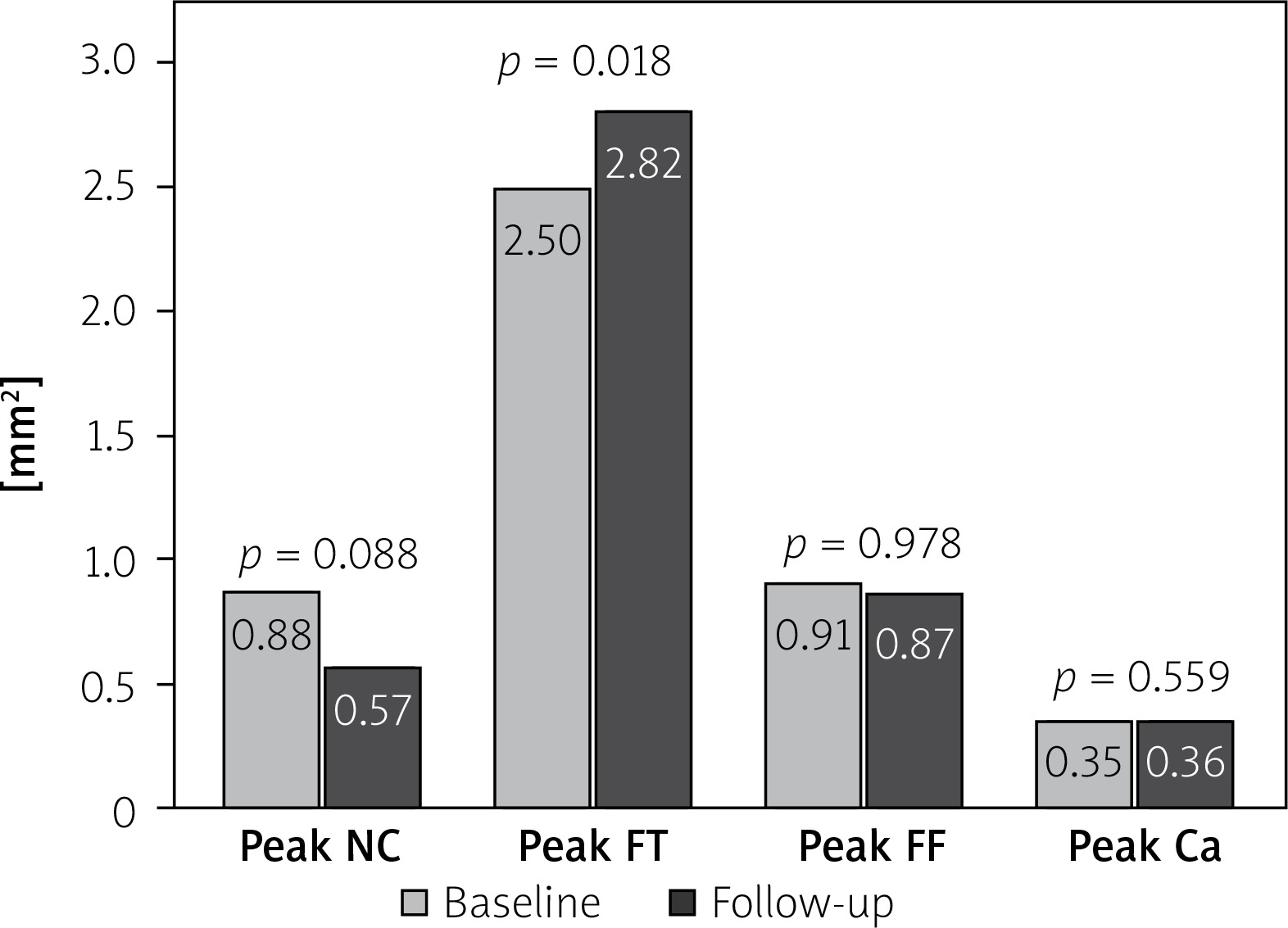 | Peak total FF + NC [mm2] | 1.75 (1.08–2.37) | 1.55 (0.94–2.43) | 0.786 |