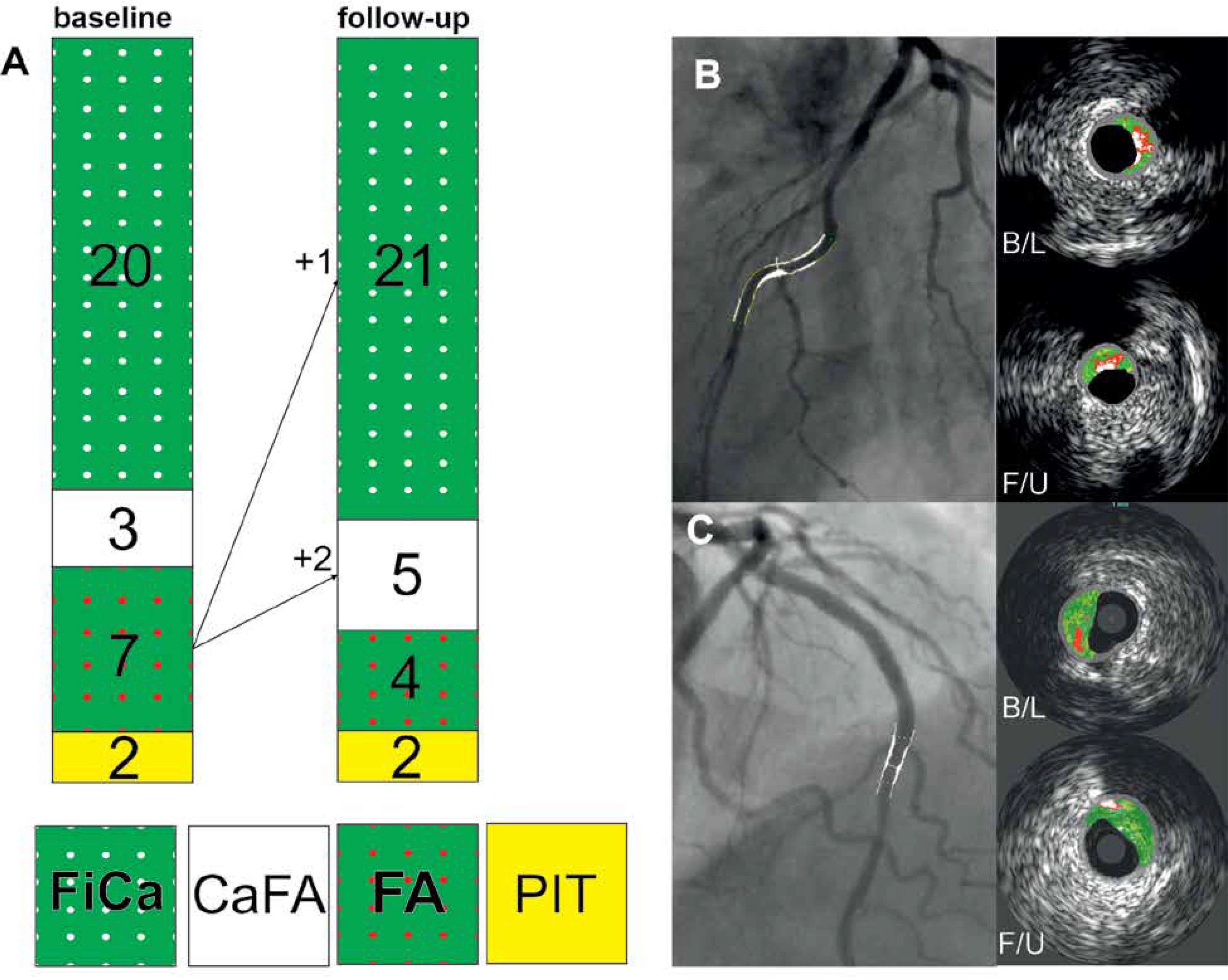 Evolution of infarct-related artery atherosclerotic plaque phenotypes in this study (A) and typical examples (B, C). Note that the overall plaque phenotype remained stable – both taken as an absence of “unstable” plaque phenotypes (thin-cap fibroathaeroma, calcified thin-cap fibroatheroma) and (also) as a lack of any major changes in the individual plaque phenotypes (A). Two fibroatheromas (ie., “thick”-cap fibroatheroma) progressed to the calcified fibroatheroma phenotype and one other to the fibro-calcific phenotype (both phenotype changes consistent with an increase in plaque stability); the remaining 30 plaques maintained their phenotype (A). B is an example of a stable calcified fibroatheroma; C shows an evolution from a (“thick”-cap) fibroatheroma to a fibro-calcific plaque. Also note the importance of the use of landmarks to ensure that evaluation occurs at the same “site” at baseline and at 12 months