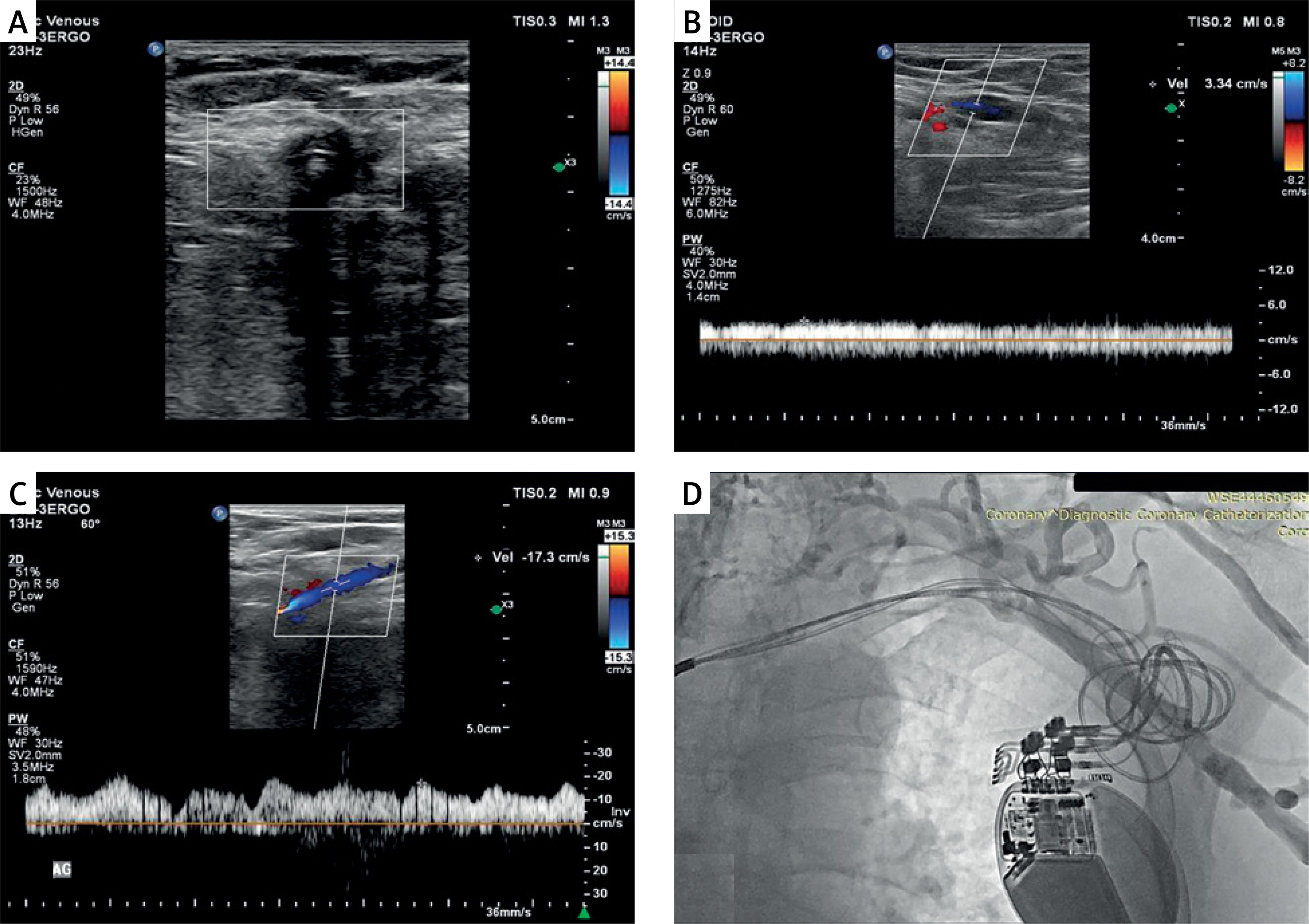 A – Doppler USG image of flow loss in the subclavian vein due to luminal obstruction with 3 pacemaker leads. B – Doppler USG image pertaining to the ipsilateral axillary vein featuring subclavian vein occlusion: i) disappearance of respirophasic flow, ii) decreased flow (3.34 cm/s) iii) antegrade continuous flow. C – Normal Doppler USG image pertaining to the contralateral axillary vein of a patient with left subclavian vein occlusion; i) antegrade respirophasic flow pattern, ii) normal flow velocity (17.3 cm/s). D – Verification of the occlusion by Doppler USG in the left subclavian vein of the same patient with venography image