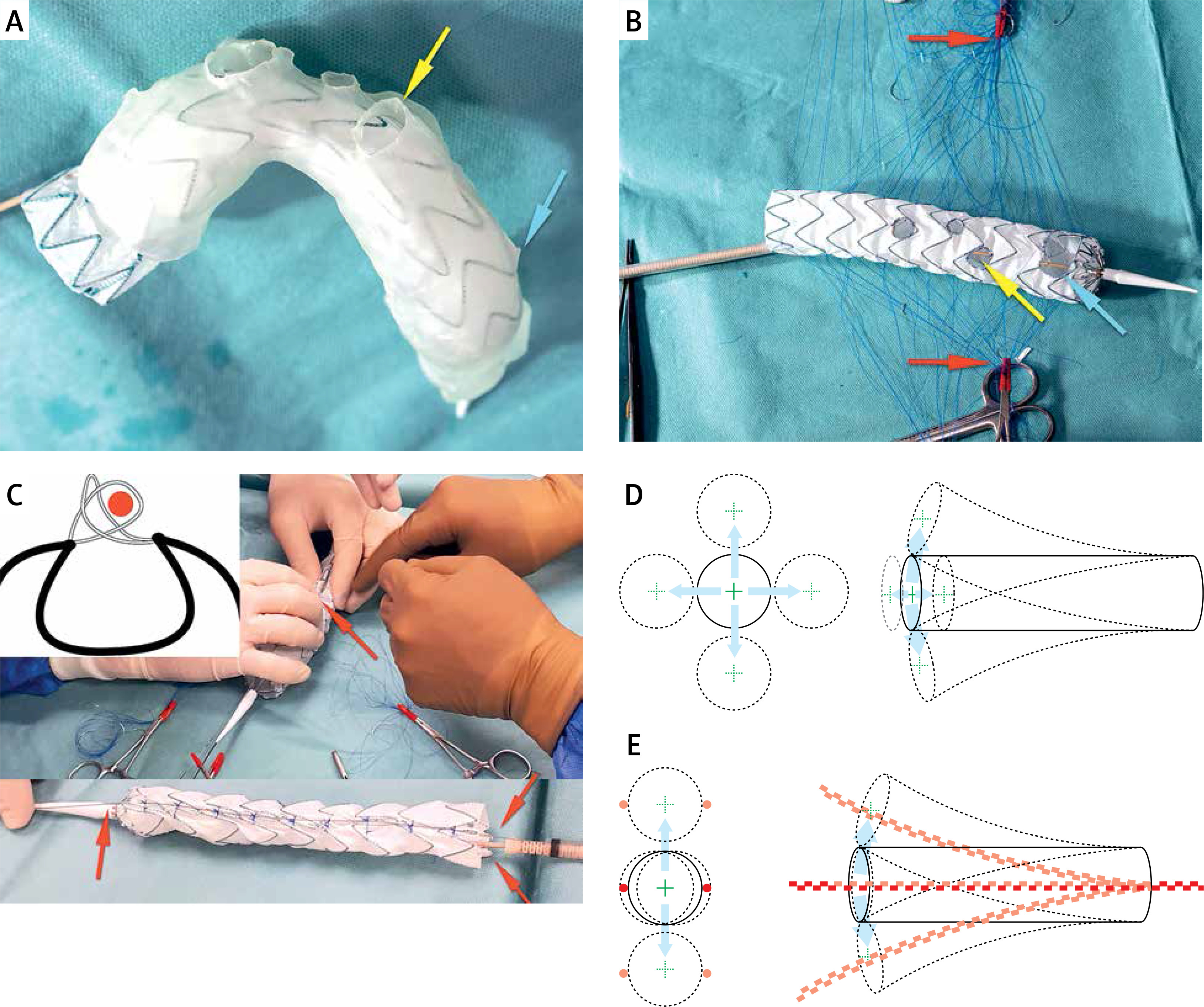 Principle of graft modification. A – 3D printing as a template for PMEG. B – Fenestration edge lined with the wire. PMEG ready for completing dual longitudinal diameter-reducing ties. C – Dual longitudinal diameter- reducing ties made with two non-locking Prolene loops one of which goes around a V18 Control wire (DLT wire shown in red). D – Delivery system without double lateral reducing ties can bend in any direction. E – Double lateral reducing ties limit the bending of the delivery system to only one plane. Red arrows indicate the Prolene suture needed to knot non-locking Prolene loops for dual longitudinal diameter-reducing ties. Yellow arrow indicates innominate artery. Blue arrow indicates the coronary bypass outflow