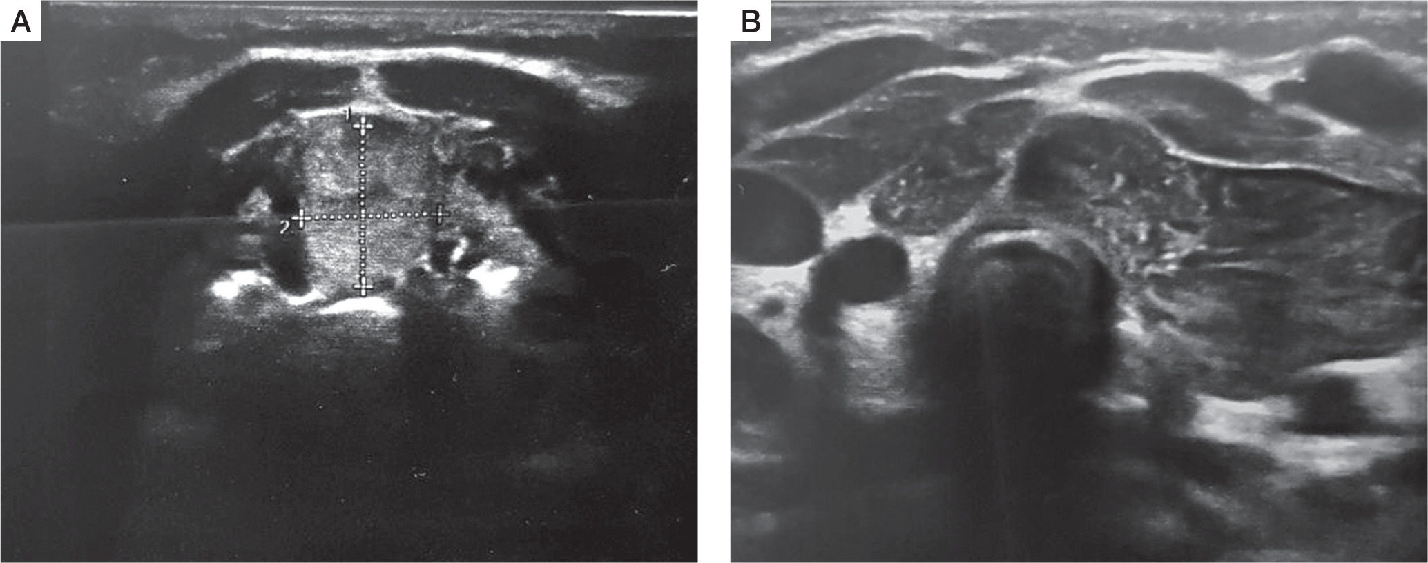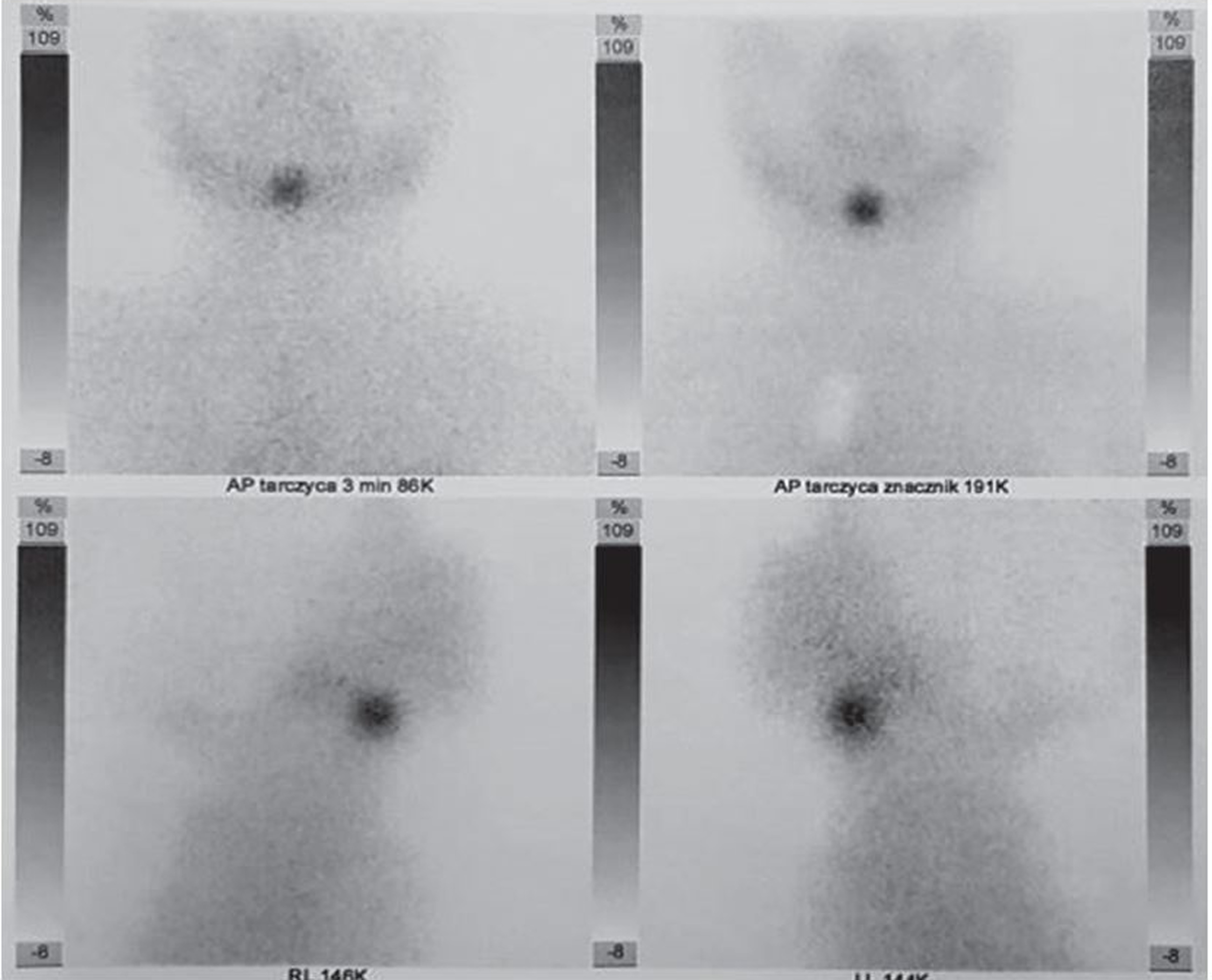 A female infant aged 3 months was admitted to the outpatient endocrine clinic due to suspicion of primary hypothyroidism. The TSH level in a random venous blood sample was 28 µIU/ml. The child was born at 38 weeks of gestational age by caesarean section, from the second pregnancy of nonconsanguineous parents. During pregnancy the mother was receiving levothyroxine in a dose of 50 µg/day due to elevated TSH level. Birth weight was 3700 g (0.97 SD), length was 57 cm (4.22 SD), and head circumference was 33 cm (–0.3SD). Apgar score was 10 in the first minute. The first result of a screening test for TSH was slightly above the upper limit of the normal range (TSH 19.94 µIU/ml; N < 18 µIU/ml), but when repeated on 6th day it was normal (9.96 µIU/ml; N: < 12 µIU/ml). Postpartum the mother started to breast feed. There was no need to continue the levothyroxine supplementation. An additional TSH test was performed because of the mother’s concerns about the previous positive result. At admission the body weight 7.1 kg, which was proper for body length (67 cm), both above the 97th percentile. The anterior fontanelle’s size was 1 × 1 cm. The heart rate was 110 bpm. The child did not present any signs of abnormal thyroid function. The neurological development was appropriate for the child’s age. No infection occurred during the first 3 months of life. The diagnosis of primary subclinical hypothyroidism was established on the basis of a blood test performed in the endocrine clinic: TSH 26.3 µIU/ml (N: < 10 µIU/ml), with FT4 14.7 pmol/l (N: < 10–25 pmol/l) and fT3 6.9 pmol/l (N: 3–8 pmol/l), and Tg (thyroglobulin) 455 ng/ml (N: 3.5–77 ng/ml). Neck ultrasonography (US) revealed ectopically located thyroid tissue in the submandibular area (Fig. 1). Scintigraphy with technetium-pertechnetate (99mTc) confirmed submandibular thyroid gland with empty fossa (Fig. 2). The treatment with liquid levothyroxine in the daily dose of 2 µg per kg of body weight was introduced. The control examination after 2 weeks revealed the normalization of TSH level (7.56 µIU/ml) with fT4 (16.7 pmol/l), and fT3 (6.9 pmol/l) within normal range. In the US control after one year, the dimensions of the ectopic thyroid gland decreased (11 × 12mm), and morphology and biochemical tests were within normal range. At 12 months of age the child showed normal psychomotor development. The dose of the levothyroxine was 3 µg/kg/day.