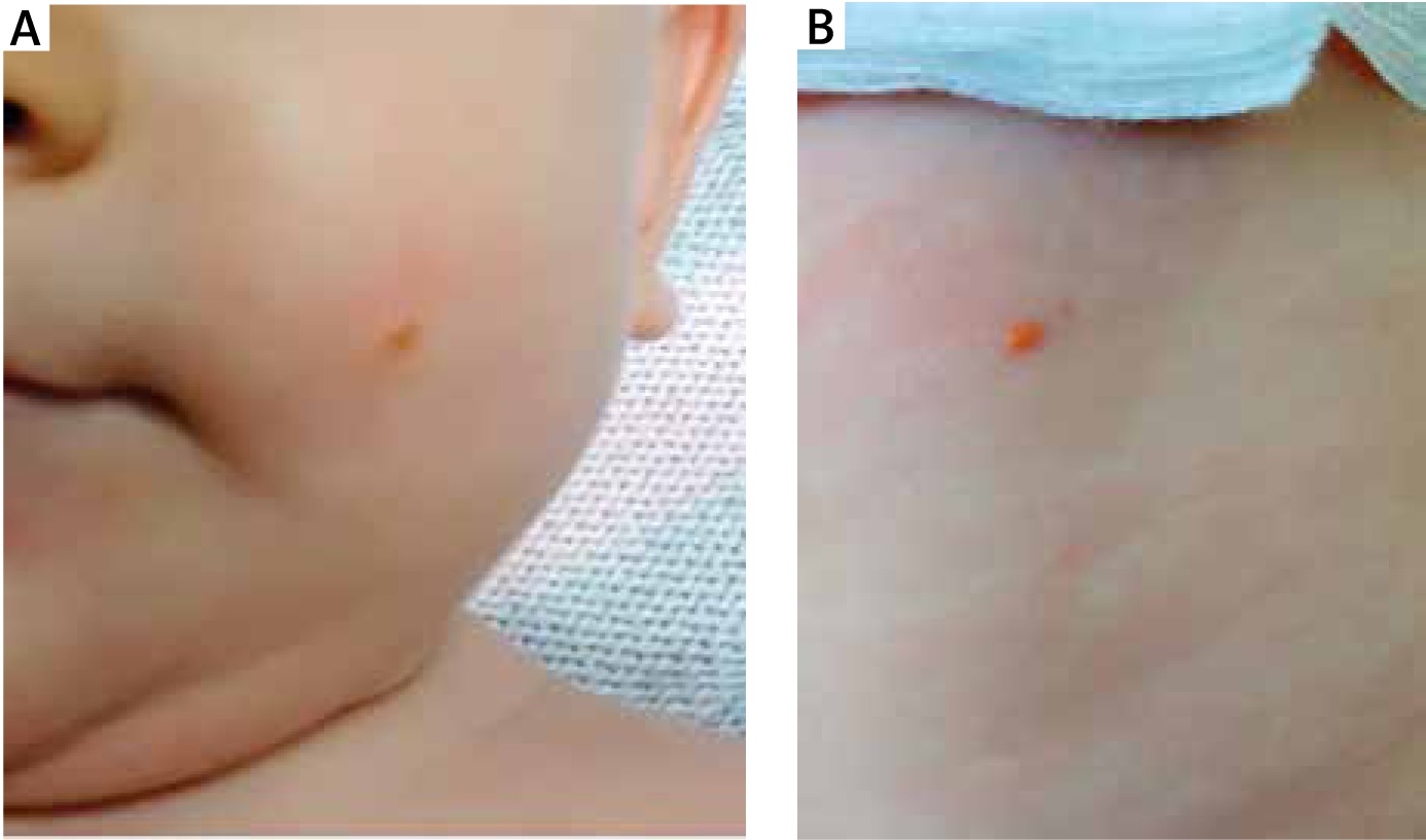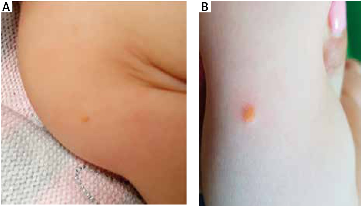 A 7-month-old girl sought medical attention in an outpatient dermatology clinic because of yellowish nodular changes located on her left cheek, on the brachial region – a lesion on the right arm, on the back and in the groin area. The lesions persisted for more than 3 months and the last change was noticed in the groin area 7 days before the medical appointment. During physical examination the occurrence of dome-shaped, well-demarcated, several millimetres in diameter, painless and non-itching nodules was observed. Besides, the girl was suffering from no other disorders, was taking no medications permanently and was under no medical specialist’s care. The child was caesarean-born in the first pregnancy and received 10 points in APGAR score. The mother was taking dydrogesterone during pregnancy because of a threatened miscarriage. A sample of the skin was obtained from the child’s lesion and on the basis of the outcome of histopathological examination, xanthogranuloma juvenile was diagnosed. The girl was also referred to an ophthalmological and paediatric clinic to undergo further diagnostic tests that excluded any extracutaneous lesions.