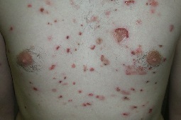 Pęcherzyca liściasta w odmianie opryszczkowatej u młodego mężczyzny (surowicze anty-DSG1 IgG > 200 RU/ml; anty-DSG3 IgG 0,234 RU/ml; punkt odcięcia 20 RU/ml).