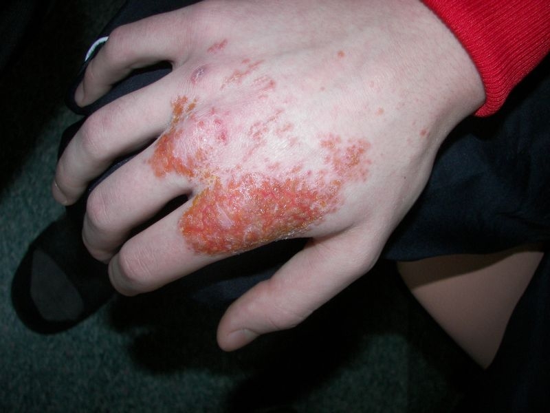 Prawidłowa odpowiedź: d) zmiany o charakterze wyprysku nadkażonego bakteryjnie