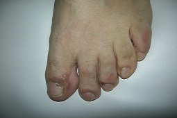 Skupienia pęcherzyków na wałach paznokciowych palucha („zanokcica pęcherzycowa”) u mężczyzny w średnim wieku z postacią skórno-śluzówkową PV (surowicze anty-DSG1 IgG >200 RU/ml; anty-DSG3 IgG 166, 796 RU/ml; punkt odcięcia 20 RU/ml).