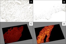 A. Ekspresja DSG3 na poziomie białka w ognisku BCC (IHC); B. Ekspresja DSG3 na poziomie białka w zdrowym naskórku (IHC); C. Ekspresja DSG3 na poziomie mRNA w ognisku BCC (FISH; 6-FAM); D. Ekspresja DSG3 na poziomie mRNA w zdrowym naskórku (FISH; 6-FAM)