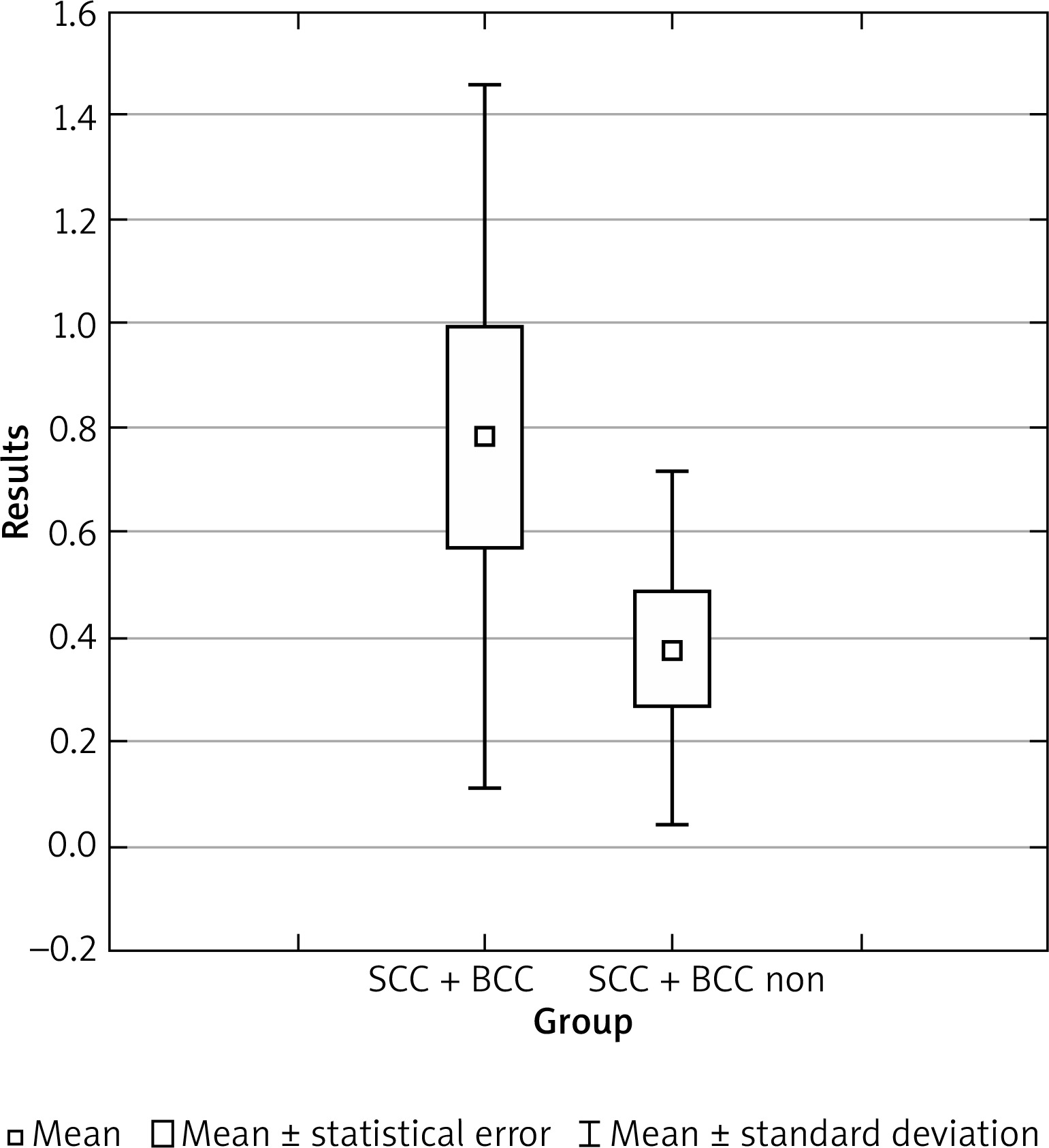 Statistically significant differences were observed between SCC/BCC vs. SCC non/BCC non groups with p = 0.027 for the sign test, and p = 0.022 for the Wilcoxon pairwise order test.