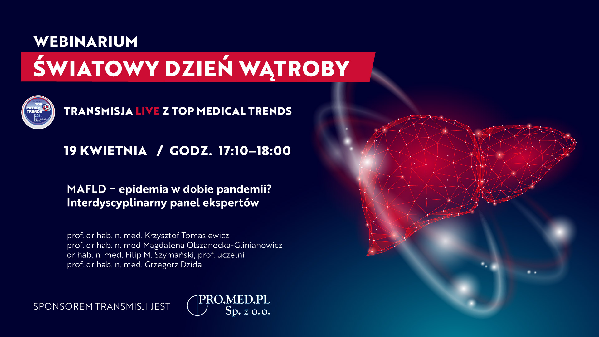 Zapraszamy do udziału w bezpłatnym wydarzeniu podczas Top Medical Trends 2021. Z okazji Światowego Dnia Wątroby 19 kwietnia o godz. 17.10. przeprowadzimy transmisję live z interdyscyplinarnej debaty ekspertów.