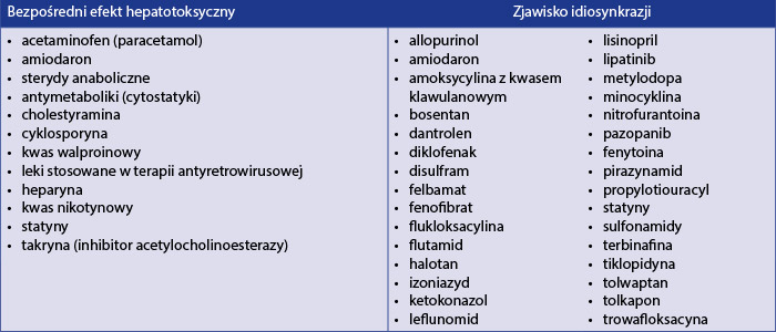 Leki potencjalnie uszkadzające wątrobę działają poprzez tzw. bezpośredni efekt hepatotoksyczny, który zależy od przyjętej dawki leku, jest możliwy do przewidzenia, charakteryzuje się krótkim okresem latencji (czas od przyjęcia leku do wystąpienia objawów uszkodzenia wątroby), wynoszącym zwykle 1–8 tygodni, i który można zaobserwować u wielu pacjentów. W ten sposób działa paracetamol, będący najczęstszą przyczyną ostrej niewydolności wątroby. Drugi mechanizm działania to zjawisko idiosynkrazji – nie do końca wyjaśniona, rzadko występująca nadwrażliwość na hepatotoksyczny efekt danego leku. W tym przypadku okres latencji może się wahać w szerokich granicach – od 1 tygodnia do nawet 12 miesięcy, obraz kliniczny jest różnorodny, efekt nie zależy od dawki leku i jest trudny do przewidzenia, działanie hepatotoksyczne występuje jako reakcja immunologiczna bądź metaboliczna [9]. W tabeli 1 przedstawiono leki, które najczęściej powodują DILI, z określeniem ich mechanizmu działania.