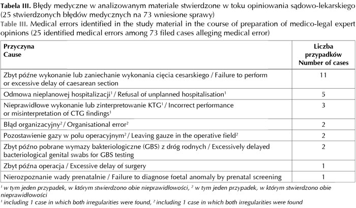 Przeanalizowano 73 opinie sądowo-lekarskie w sprawach karnych w przypadkach podejrzenia błędu medycznego w zakresie położnictwa wydanych w Katedrze i Zakładzie Medycyny Sądowej Collegium Medicum Uniwersytetu Jagiellońskiego w latach 2010–2016 – najczęściej popełnianymi błędami było zaniechanie lub opóźnienie wykonania cięcia cesarskiego mimo wskazań i nieprawidłowa interpretacja zapisu KTG.