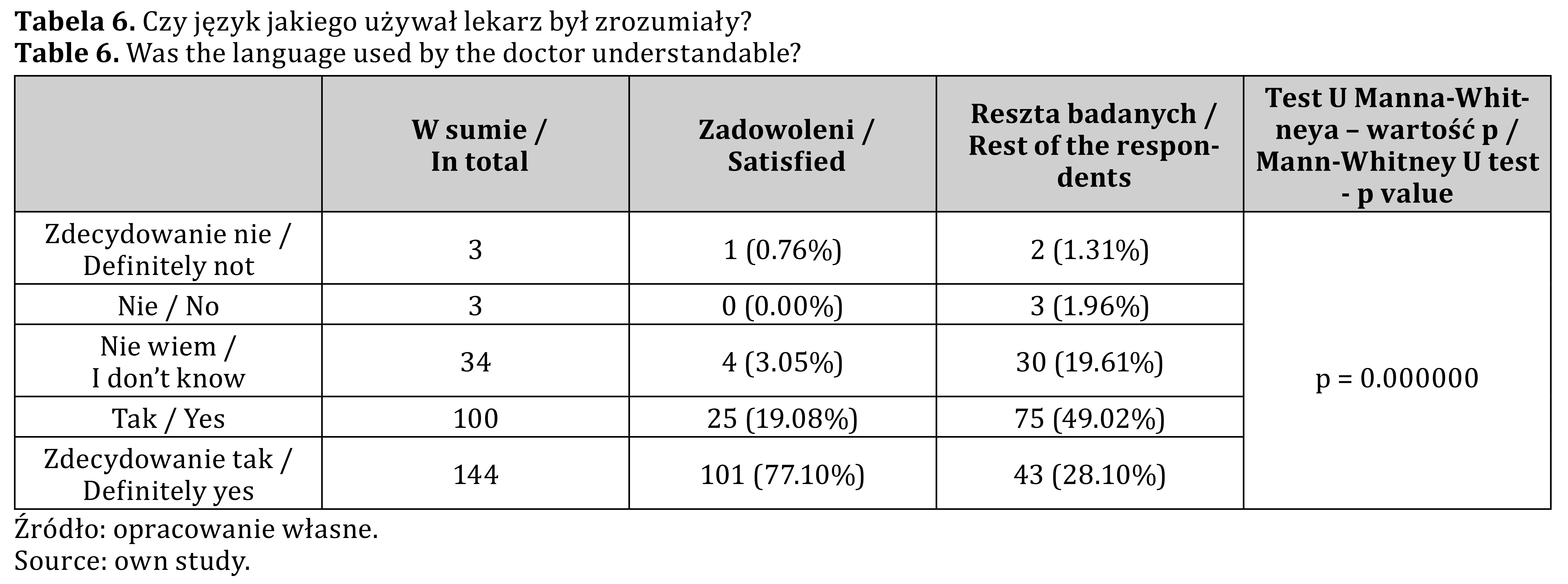 Na pytanie, czy język, jakiego używał lekarz, był zrozumiały, respondenci odpowiadali w pięciostopniowej skali, gdzie 1 oznaczało „zdecydowanie nie”, zaś 5 – „zdecydowanie tak”. Odpowiedzi na to pytanie przedstawia tabela 6, zaś test U Manna-Whitneya wykazał, że rozkład odpowiedzi istotnie różnił się pomiędzy dwoma badanymi grupami.