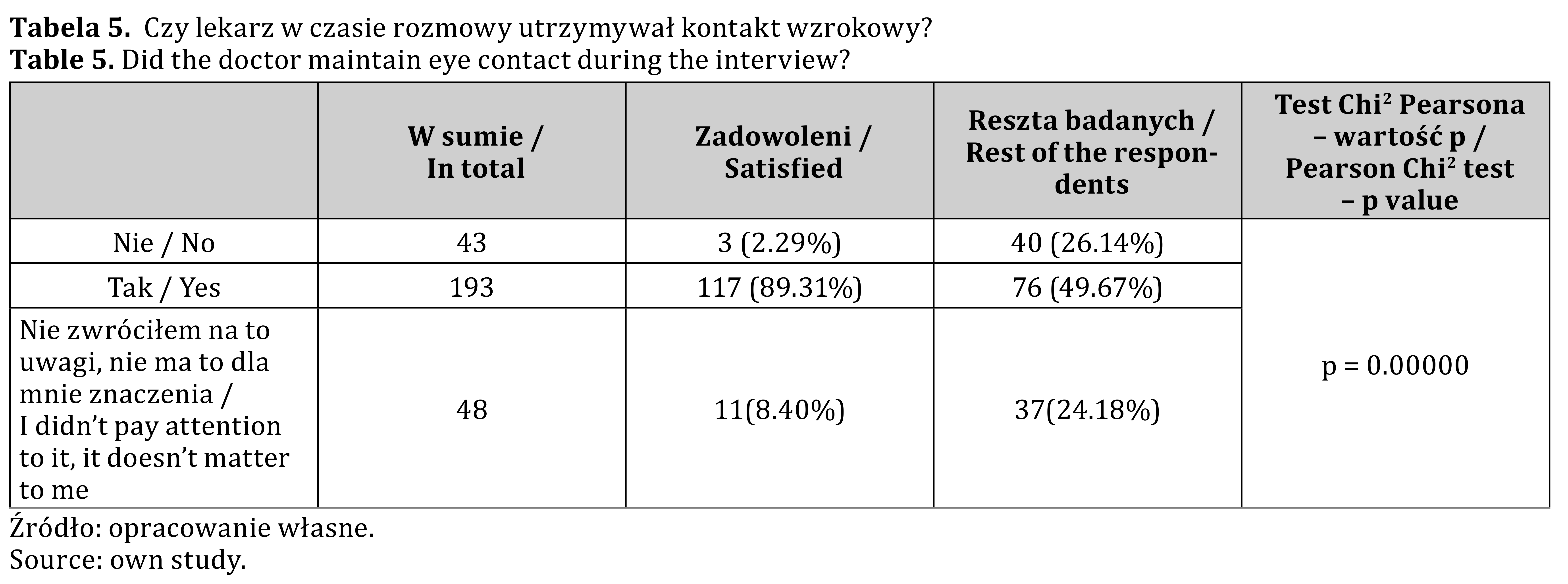 67,96 proc. badanych zadeklarowało, że lekarz utrzymywał kontakt wzrokowy w czasie wizyty. 15,14 proc. pacjentów twierdziło, że tak nie było, zaś 16,90 proc., że nie zwróciło na to uwagi. Respondenci z grupy pacjentów zadowolonych istotnie częściej wskazywali, że lekarz utrzymywał z nimi kontakt wzrokowy (89,31 proc.). Wśród reszty badanych odpowiedź tę wskazało 49,67 proc. (tab. 5)