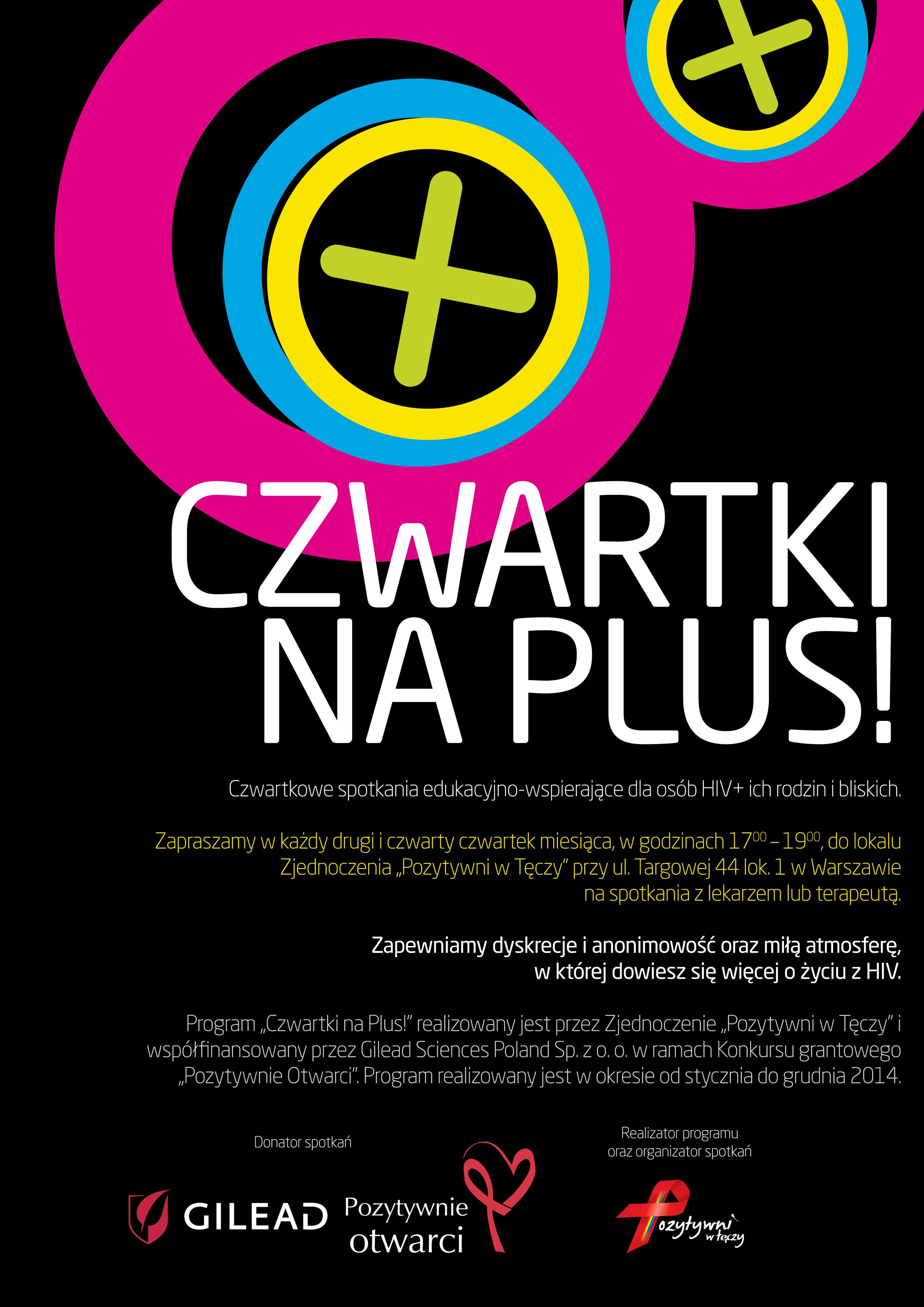 „Czwartki na plus!” to cykl profesjonalnych zajęć opracowanych i prowadzonych z myślą o ludziach żyjących z HIV – heteroseksualnych dorosłych, mężczyznach mających seks z mężczyznami, a także dla rodziców seropozytywnych dzieci. Celem jest przekazanie wiedzy m.in. o diagnostyce, leczeniu, aktywności seksualnej ludzi zakażonych, sposobach mówienia o swoim statusie bliskim, ale też lekarzom, poszukiwaniu partnerów życiowych. Zajęcia będą odbywać się w każdy drugi i czwarty czwartek w siedzibie Zjednoczenia Pozytywni w Tęczy przy ul. Targowej 44 lok. 1 od 17.00 do 19.00. Udział jest bezpłatny. Organizacja” Czwartków na plus!” w roku 2014 sfinansowana zostanie z grantu przyznanego na ten cel przez kapitułę konkursu Pozytywnie Otwarci, a ufundowanego przez Gilead Sciences.