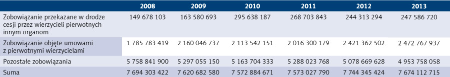 Najmniejszy udział w zobowiązaniach ogółem podmiotów, dla których organami założycielskimi są jednostki samorządu terytorialnego, mają zobowiązania przekazane w drodze cesji przez wierzycieli pierwotnych innym organom – w 2008 r. stanowiły one 1,95 proc. zobowiązań ogółem, czyli 149 678 103 zł, następnie wzrosły do poziomu 3,23 proc. w 2013 r., czyli do kwoty 247 586 720 zł, by następnie spaść do poziomu 0,23 proc. zobowiązań ogółem, czyli 26 868 533 zł, w 2019 r. Zobowiązania objęte umowami z pierwotnymi wierzycielami w 2008 r. stanowiły 23,21 proc. zobowiązań ogółem, czyli w ujęciu kwotowym 1 785 783 419 zł, w 2013 r. ich udział w zobowiązaniach ogółem wzrósł do 32,22 proc., czyli 2 472 767 937 zł, natomiast w 2019 r. wyniósł 18,54 proc., czyli 2 208 274 553 zł.