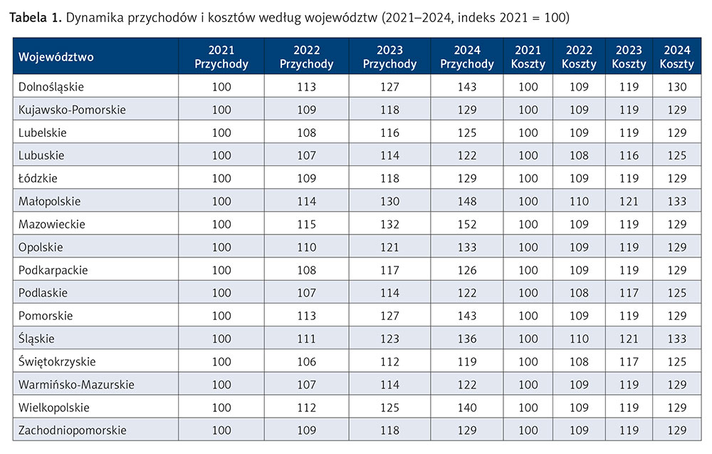 Analiza obejmuje dynamikę przychodów i kosztów w czterech przekrojach: województw, organów tworzących, poziomów PSZ oraz form prawnych. Najprostszy wskaźnik kierunku zmian to spread Δ = (dynamika przychodów) – (dynamika kosztów). Gdy Δ > 0, poprawia się marża, a gdy Δ < 0, dochodzi do jej erozji.