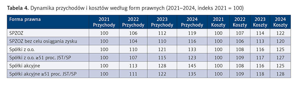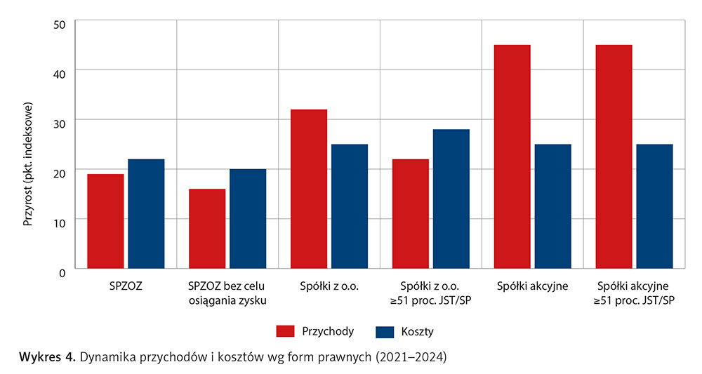 Kolejnym istotnym przekrojem analizy jest forma organizacyjno-prawna podmiotów leczniczych. Dane z lat 2021–2024 potwierdzają, że to, czy jednostka działa jako SPZOZ, czy jako spółka kapitałowa, wpływa na relację przychodów do kosztów i zdolność do generowania nadwyżek.
