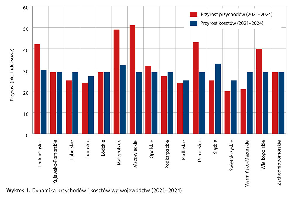 - Województwa z dużymi aglomeracjami (mazowieckie, małopolskie, dolnośląskie, pomorskie) wykazały najwyższą dynamikę przychodów, przewyższającą koszty.