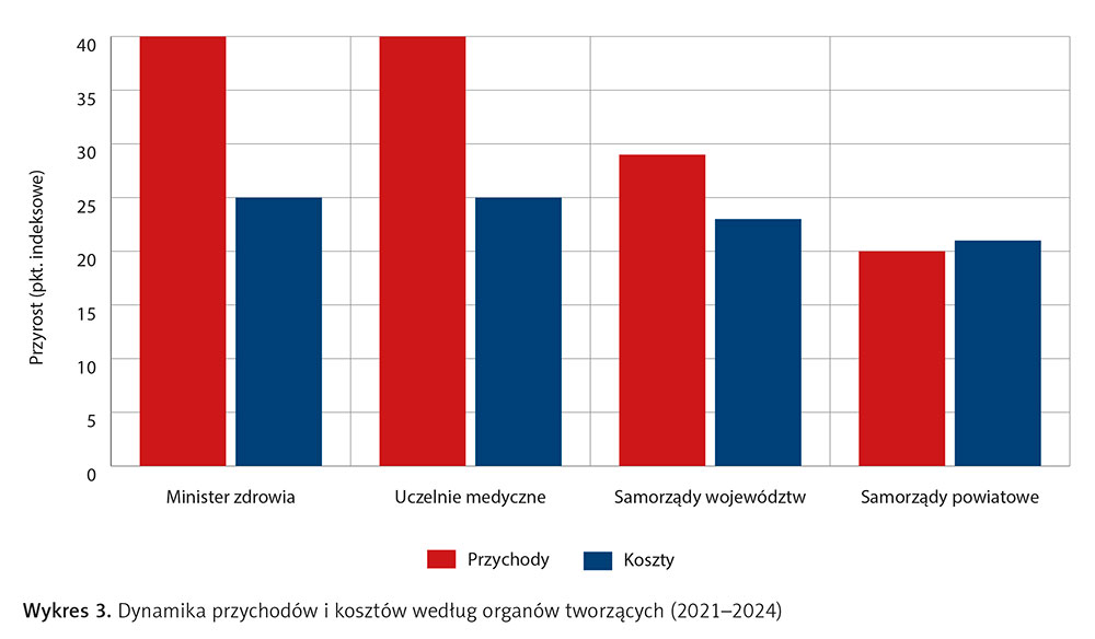 Analizujemy też dynamikę przychodów i kosztów w zależności od organów tworzących szpitale. Dane z lat 2021–2024 pokazują, że różnice wynikają zarówno z charakteru instytucji, jak i z dostępu do finansowania oraz zdolności do kontroli kosztów.