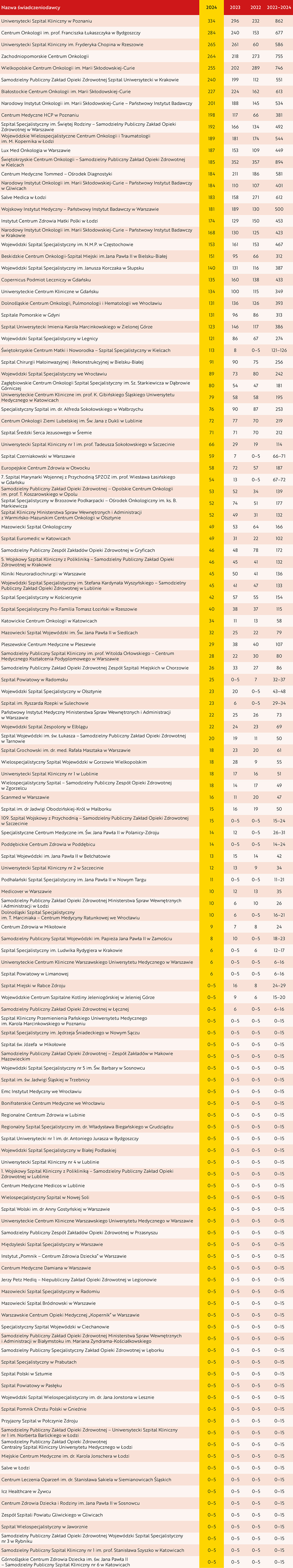 Szpitale, w których przeprowadzono jedynie kilka operacji, raportują je, podając informację o treści „mniejsze lub równe 5” – przyjęliśmy, że w tabeli podamy najwyższą wartość. Ale oznacza, że w szpitalach, przy których (w latach 2022–2024) jest liczba 15, mogły wykonać od 0 do 15 operacji.
