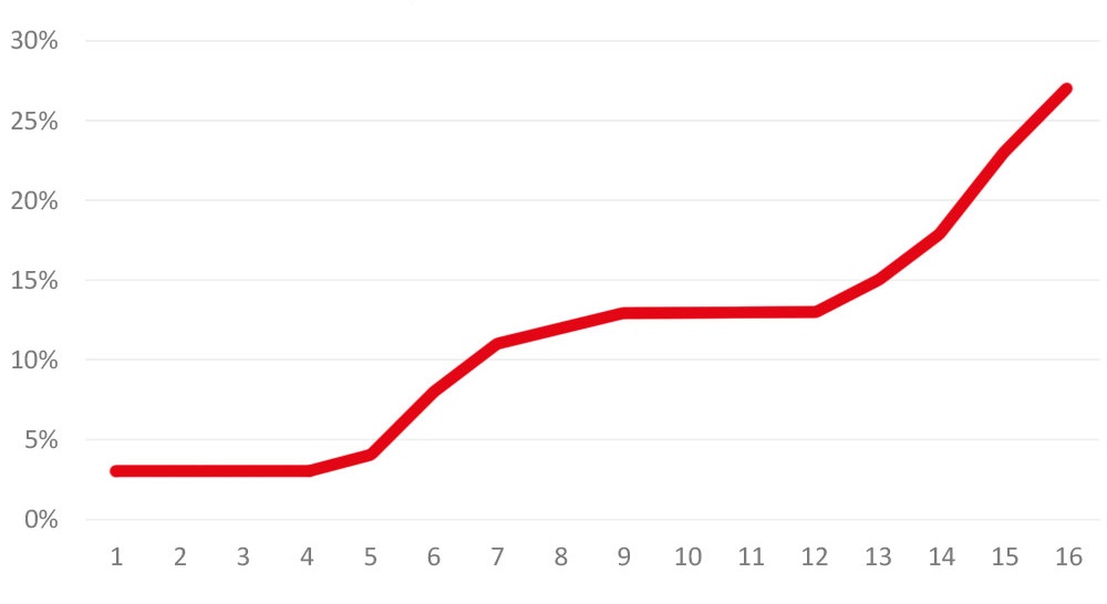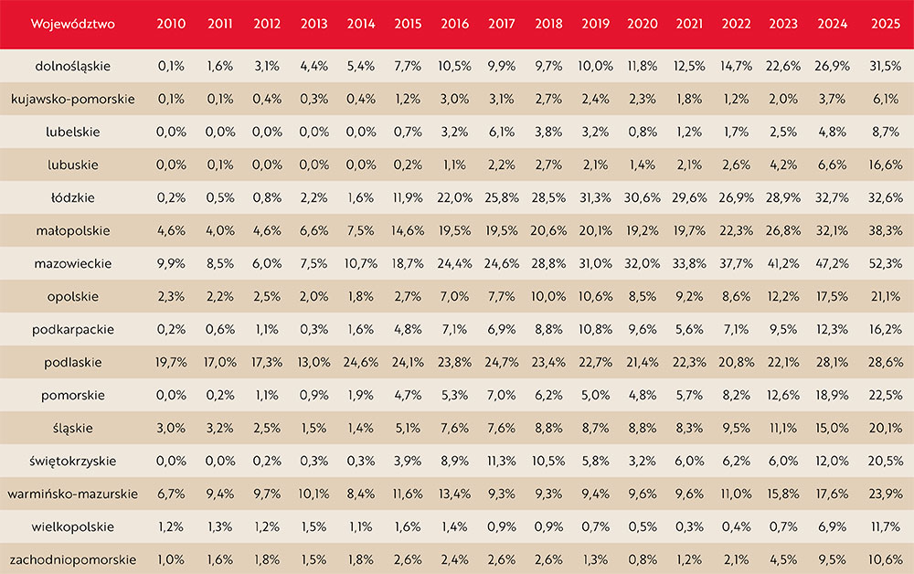 • w województwie mazowieckim wzrósł z 41 proc. do 47 proc., w łódzkim z 29 proc. do 33 proc., a w świętokrzyskim z 6 proc. do 12 proc.,